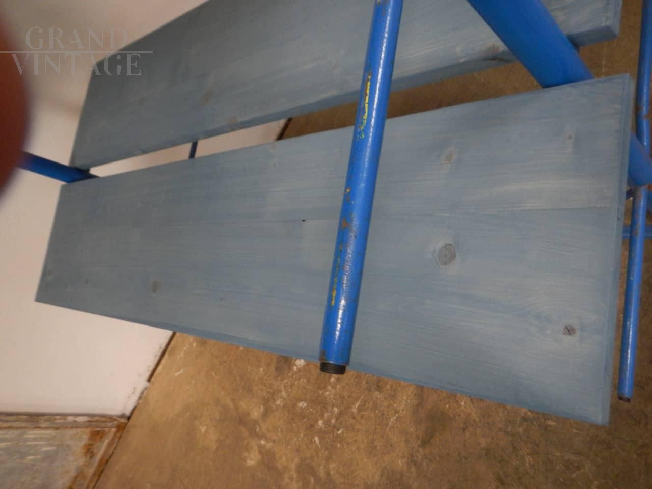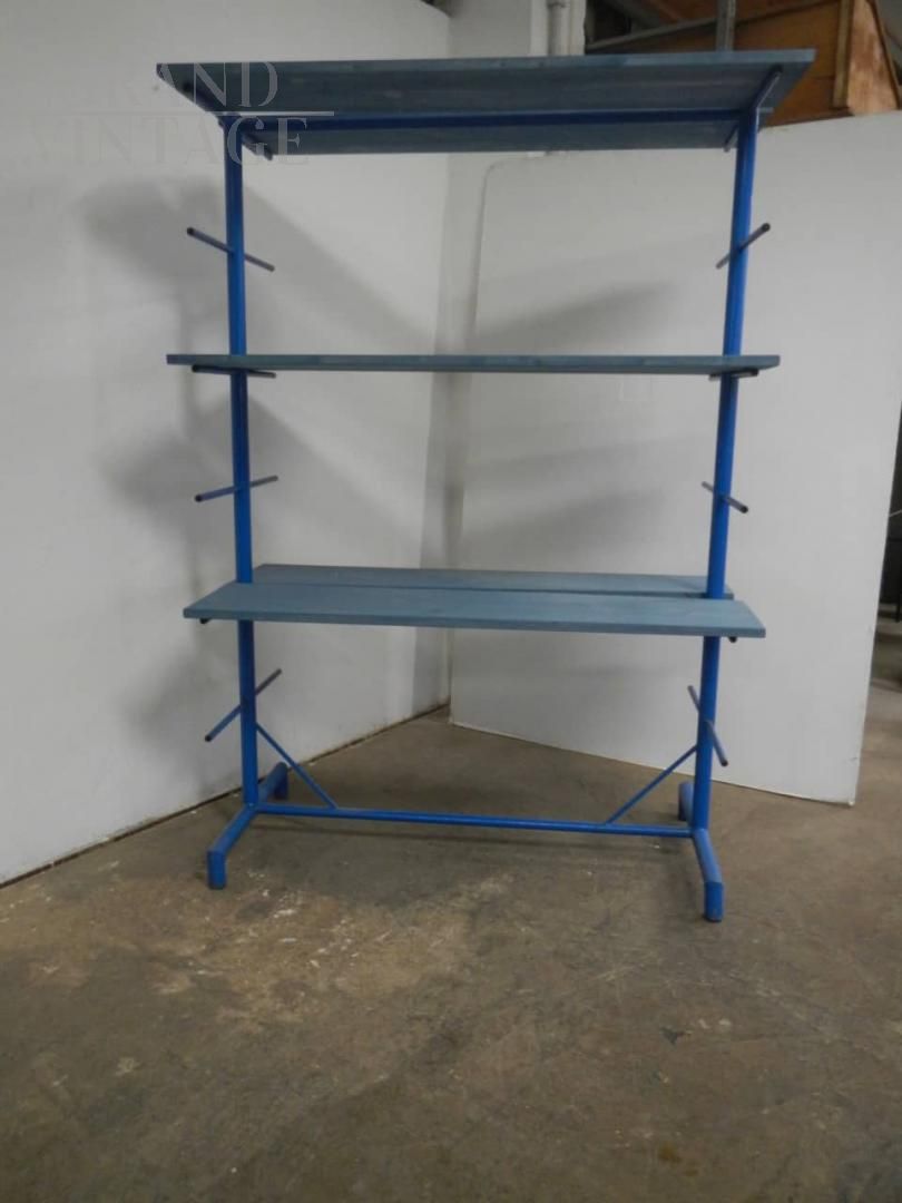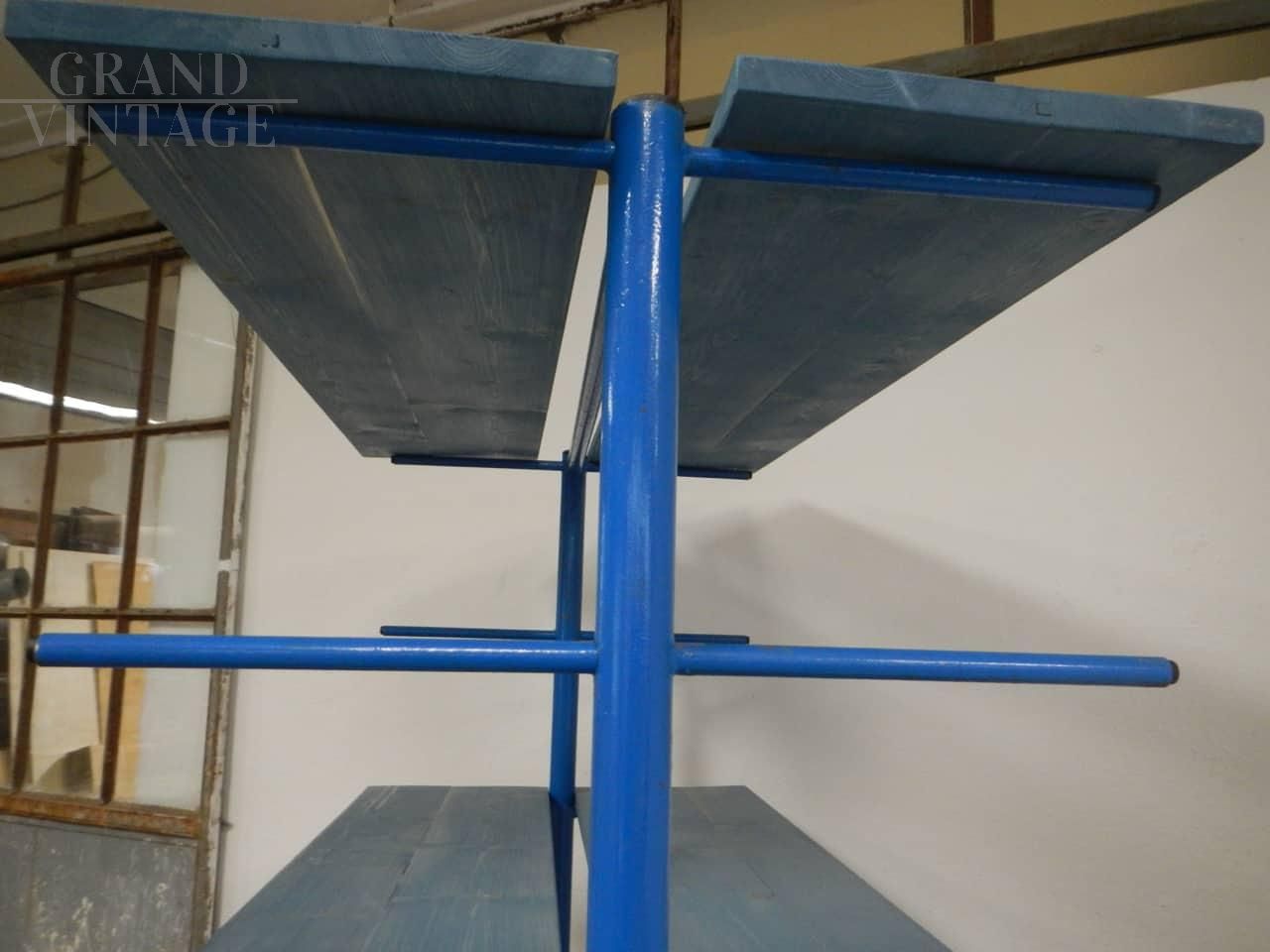 Scaffale da ceramista anni '70 laccato blu, con sei ripiani in legno di abete indipendenti da posizionare su un solo lato. Restaurato.