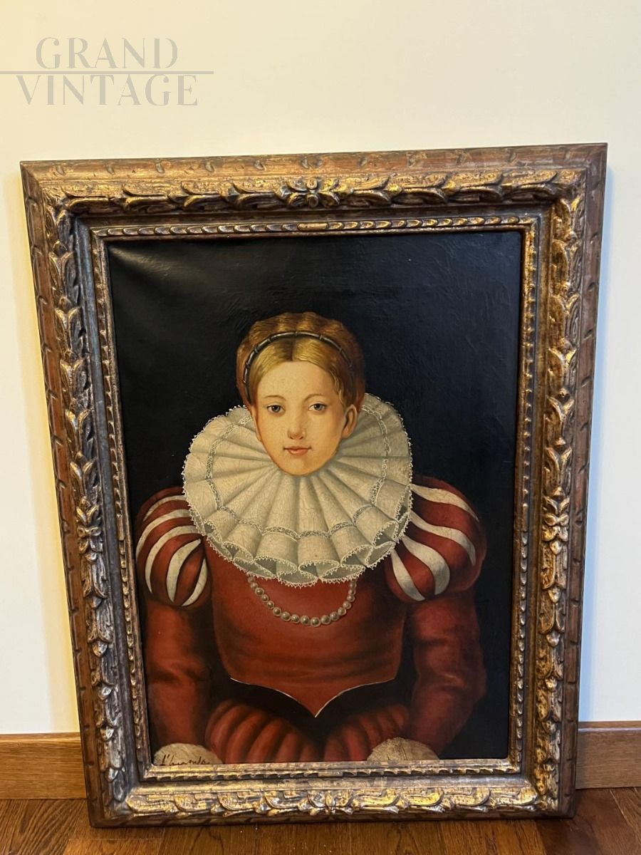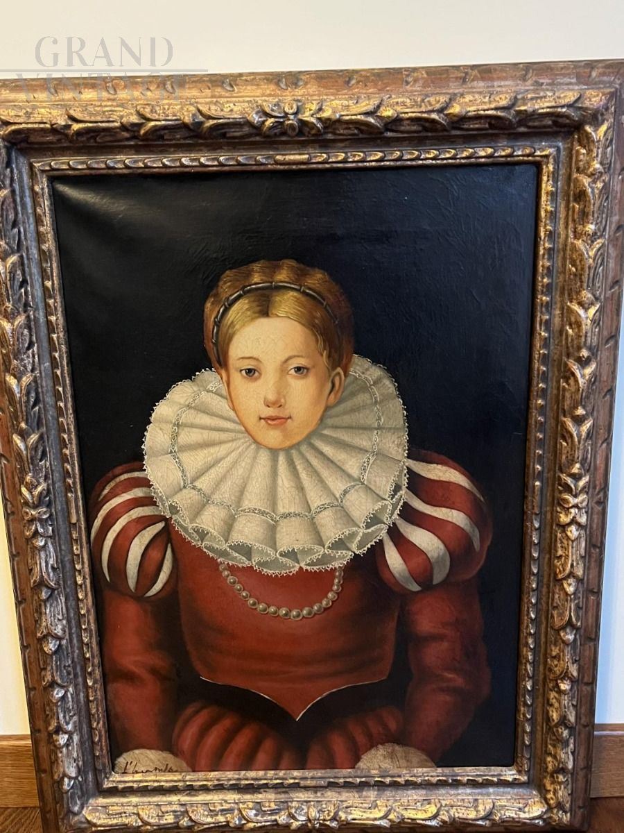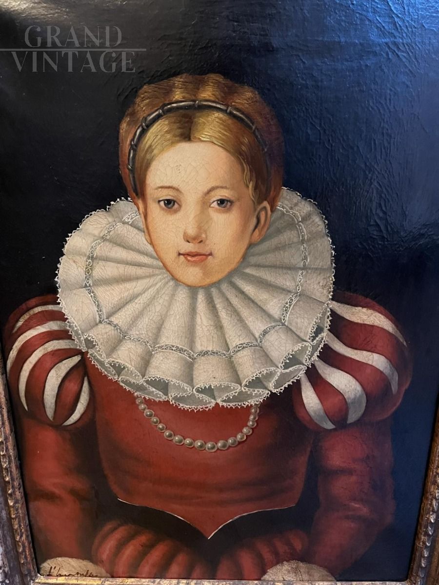 Copia d'autore del celebre Ritratto di Dama eseguito da Agnolo Bronzino nel XVI secolo ed oggi conservato agli Uffizi di Firenze. Un olio su tela che ritrae una giovane nobildonna della corte medicea, abbigliata secondo la moda spagnola. Una tela racchiusa entro una pregevole cornice dorata in legno intagliato che riprende i motivi dell'epoca. Dipinto firmato dall'autore in basso a sinistra, dotato di certificato di garanzia.