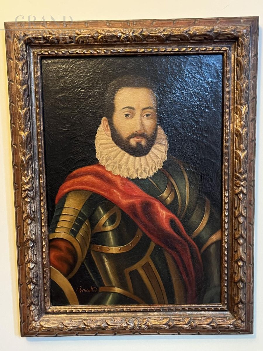 Copia d'autore del celebre Ritratto di Francesco Maria II della Rovere, duca d'Urbino, eseguito da Federico Barocci nel 1572 ed oggi conservato agli Uffizi di Firenze. Un olio su tela che ritrae il duca nella sua armatura brunita sovrastata dalla fascia ducale, la gorgiera portata al collo secondo la moda spagnola, il viso barbuto e fiero, circodato da uno scuro. Una tela racchiusa entro una pregevole cornice dorata in legno intagliato che riprende i motivi dell'epoca. Dipinto firmato dall'autore in basso a sinistra.