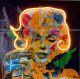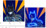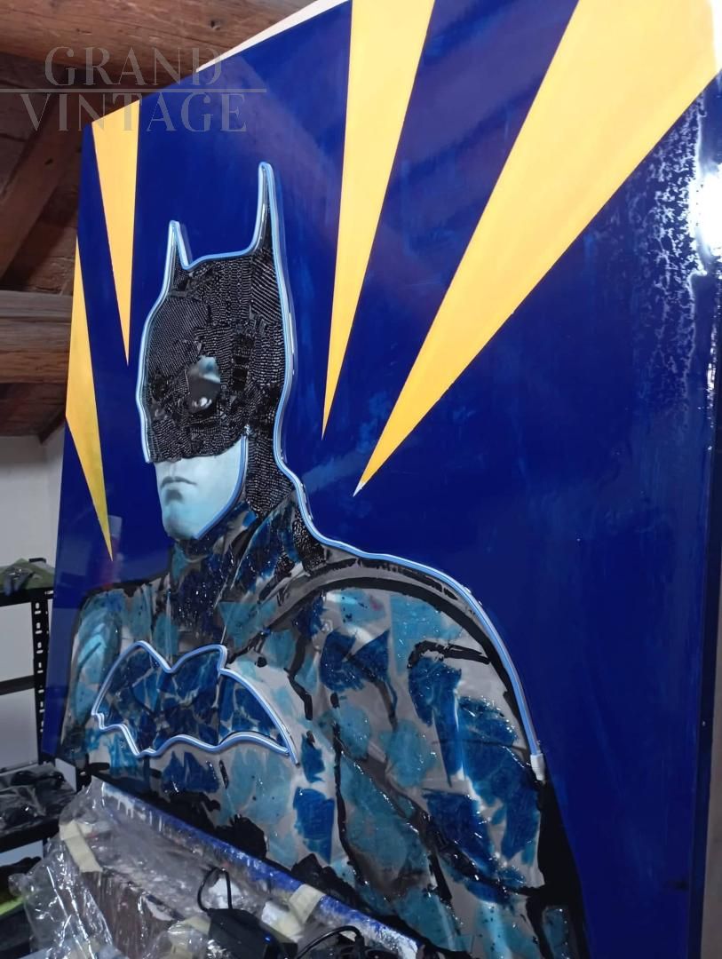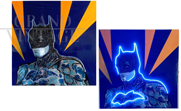 Dipinto con Batman, stampa digitale di base con colori acrilici e LED su tela, opera originale e unica di Rolando Pellini, 120 x 120 cm. Tecnica innovativa e originale per questo dipinto in stile Pop Art.