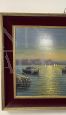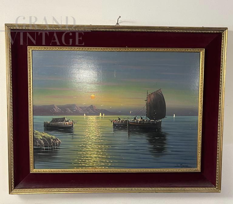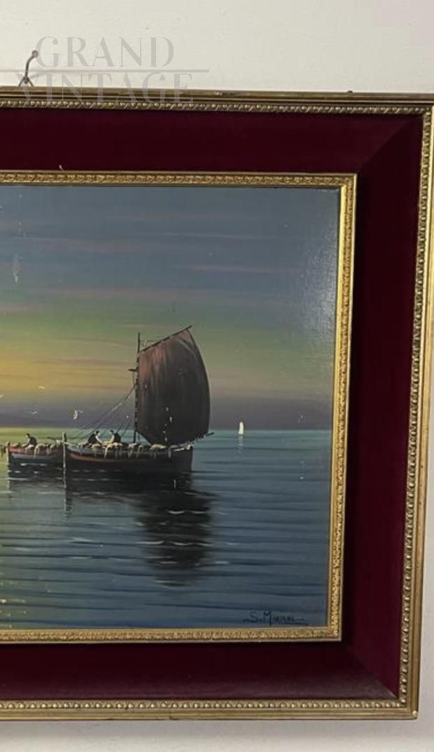 Dipinto olio su tela firmato S. Mariani raffigurante barche di pescatori al largo sotto la luce del sole, della metà del '900.