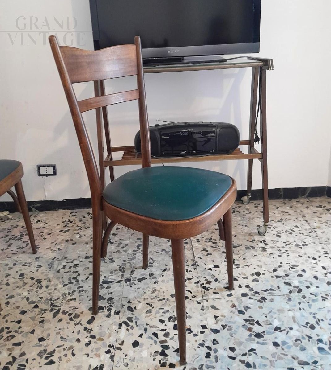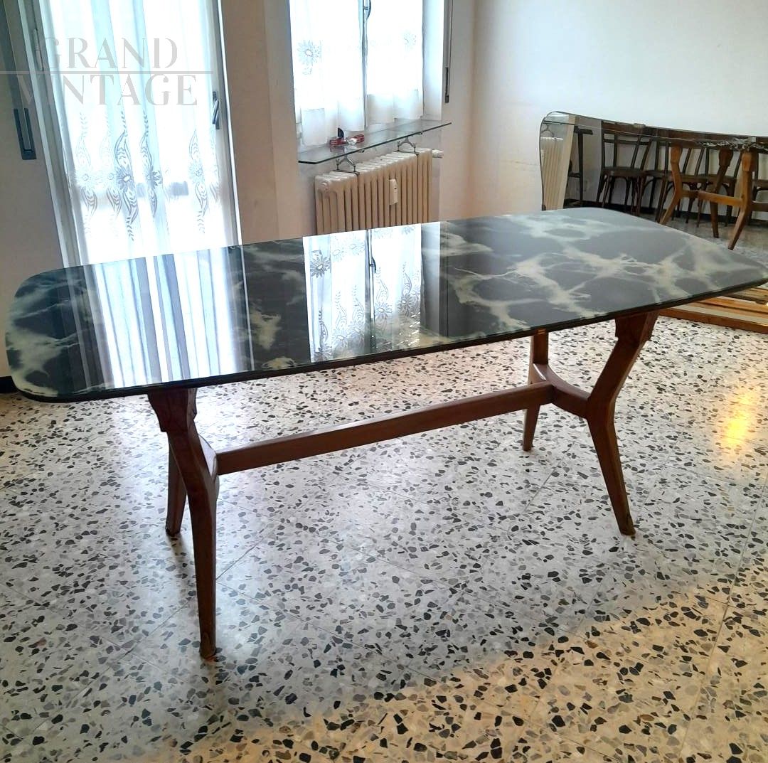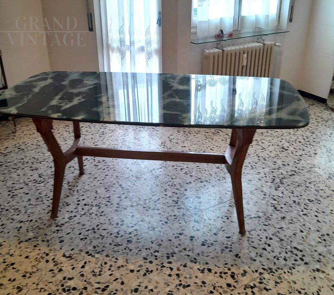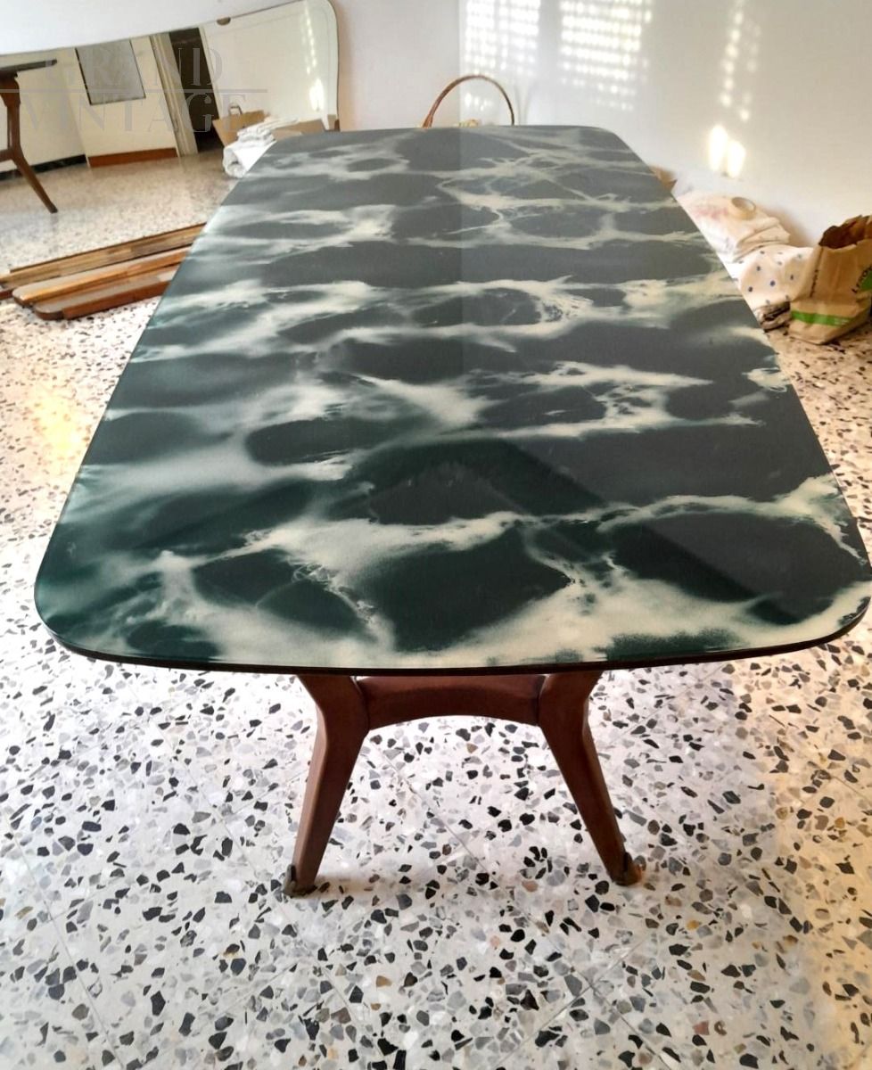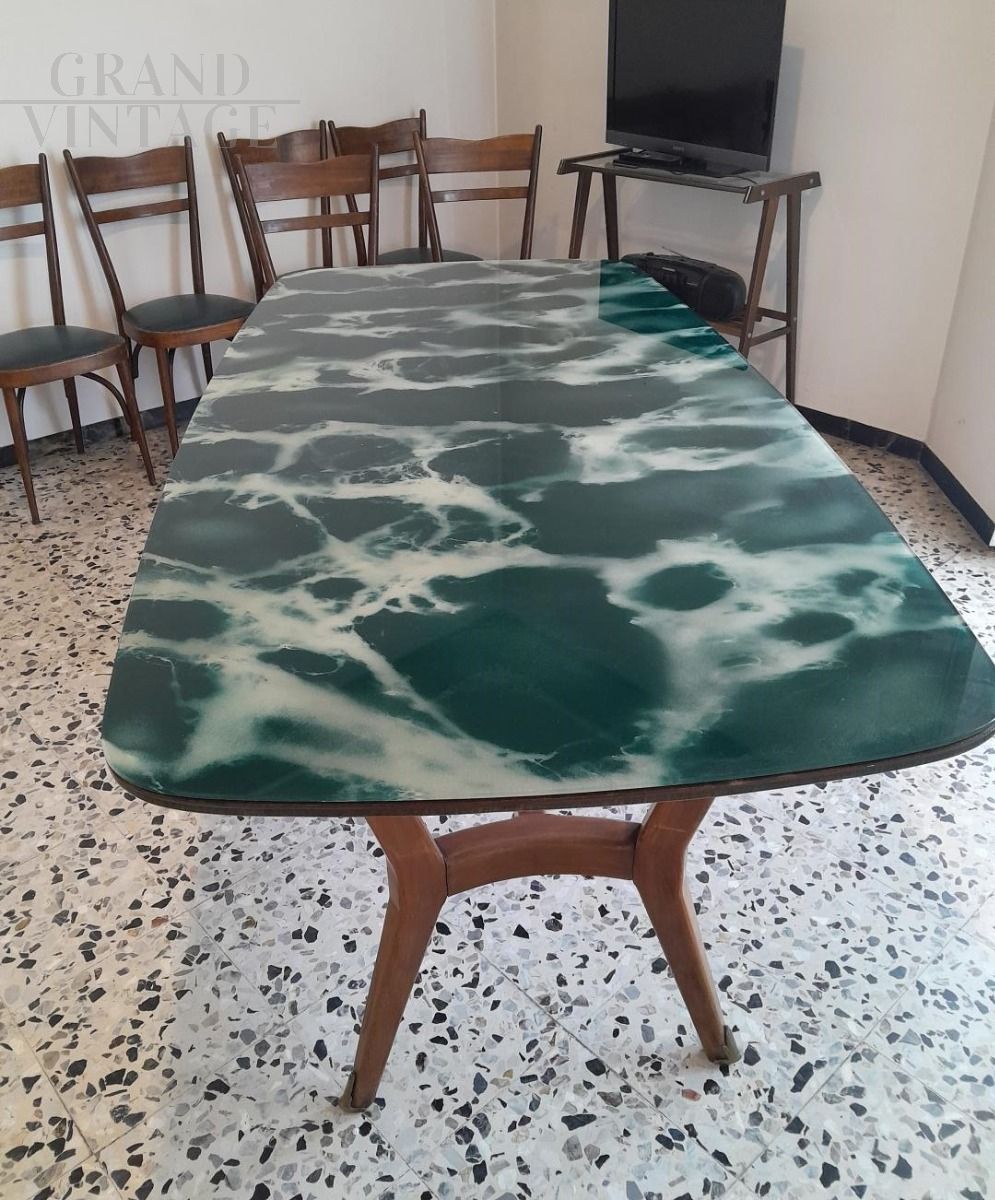 Set da sala da pranzo modernariato italiano composta da un tavolo in legno decorato con piano in vetro effetto marmo verde, e da sei sedie in legno con seduta in tessuto verde, Italia anni '50.