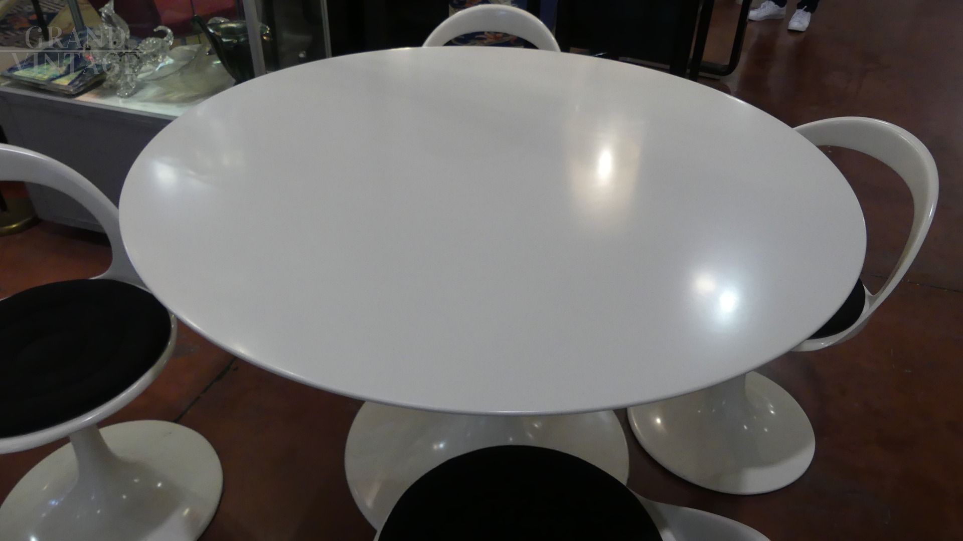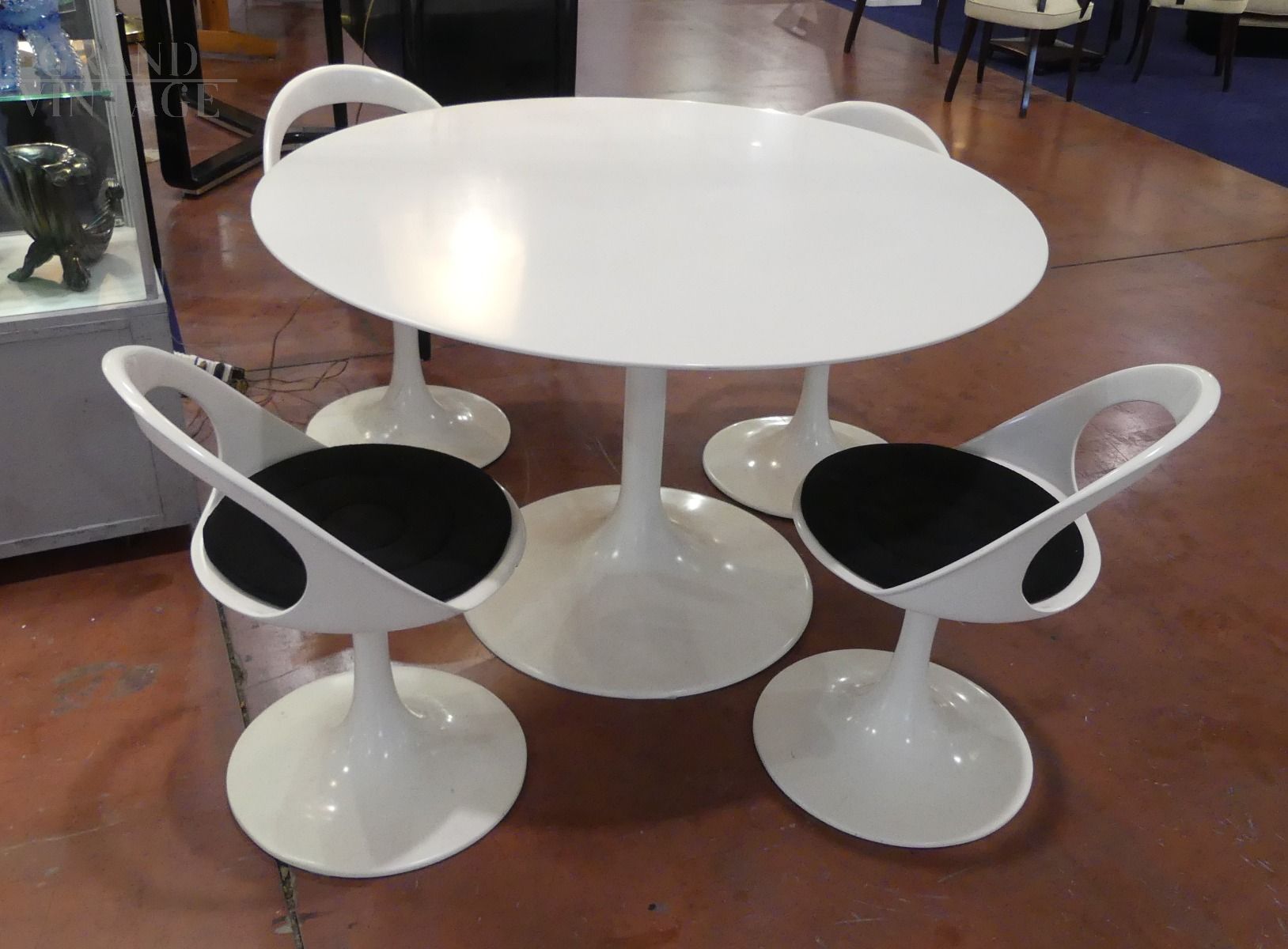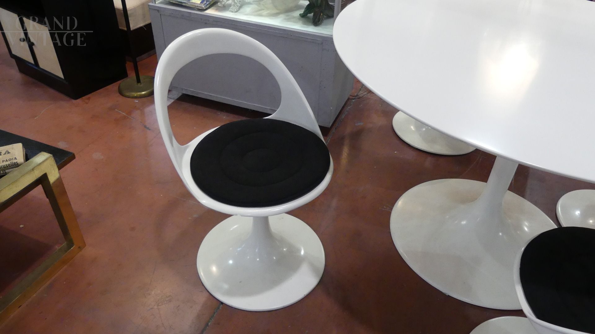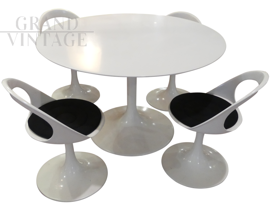 Salotto vintage completo prodotto da Acerbis, composto da tavolo e 4 sedie dalle forme che ricordano lo stile Tulip. Il materiale predominante è il vetroresina bianco.