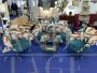 Set da salotto vintage composto da un divanetto e due poltrone degli anni '50 ritappezzati in velluto blu petrolio e con fantasia di foglie colorate, con gambe in ottone. In perfette condizioni.