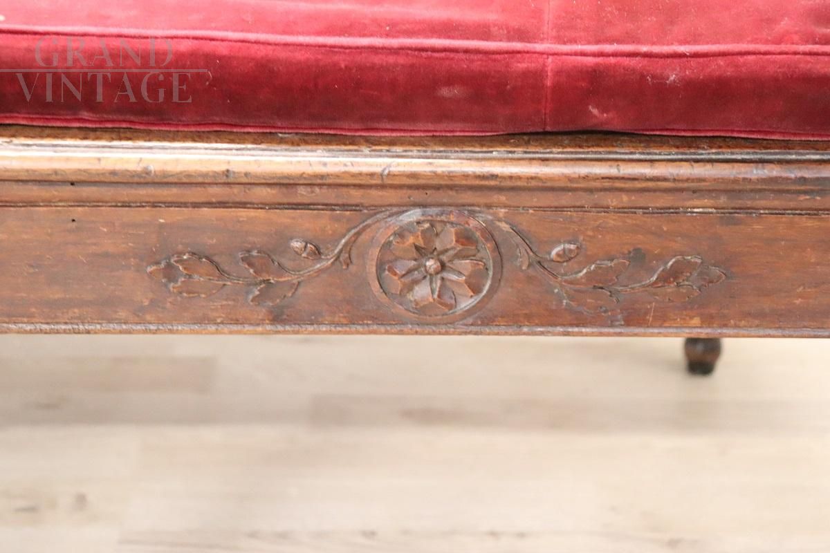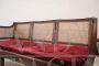 Raro set da salotto italiano antico del XVIII secolo, composto da un elegante divano lungo da circa tre posti e due sedie di accompagnamento. Realizzato da maestri ebanisti durante il periodo Luigi XVI, la struttura è in noce massello, un materiale pregiato che conferisce robustezza e bellezza al pezzo, mentre le sedute e gli schienali sono realizzati in pregiata paglia di Vienna, meticolosamente intrecciata a mano secondo le tecniche tradizionali. Il set si distingue per le sue linee semplici ma rigorose, che riflettono l'eleganza sobria ma raffinata. I sedili sono dotati di cuscini su misura e rivestiti in un ricco velluto rosso. Presenti piccoli difetti nella paglia di Vienna e macchie nel velluto. Prezzo trattabile.