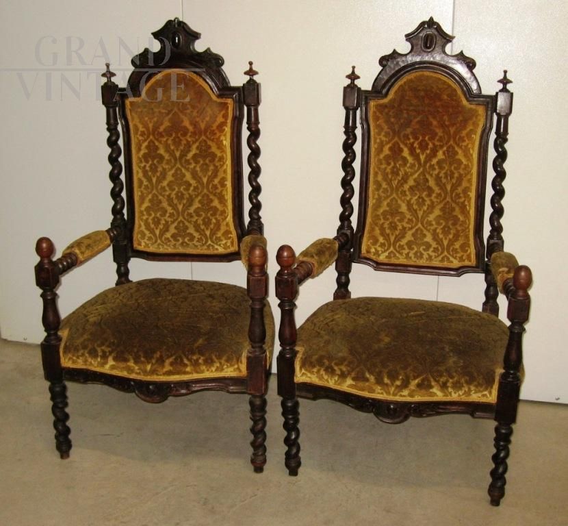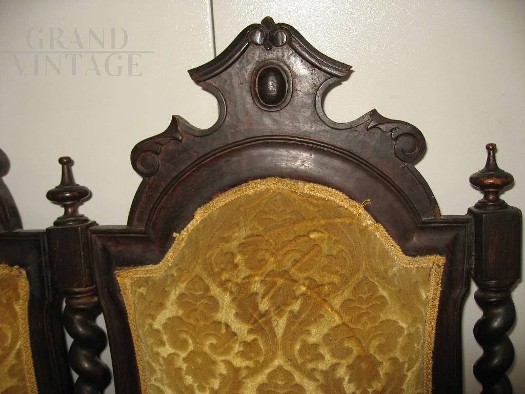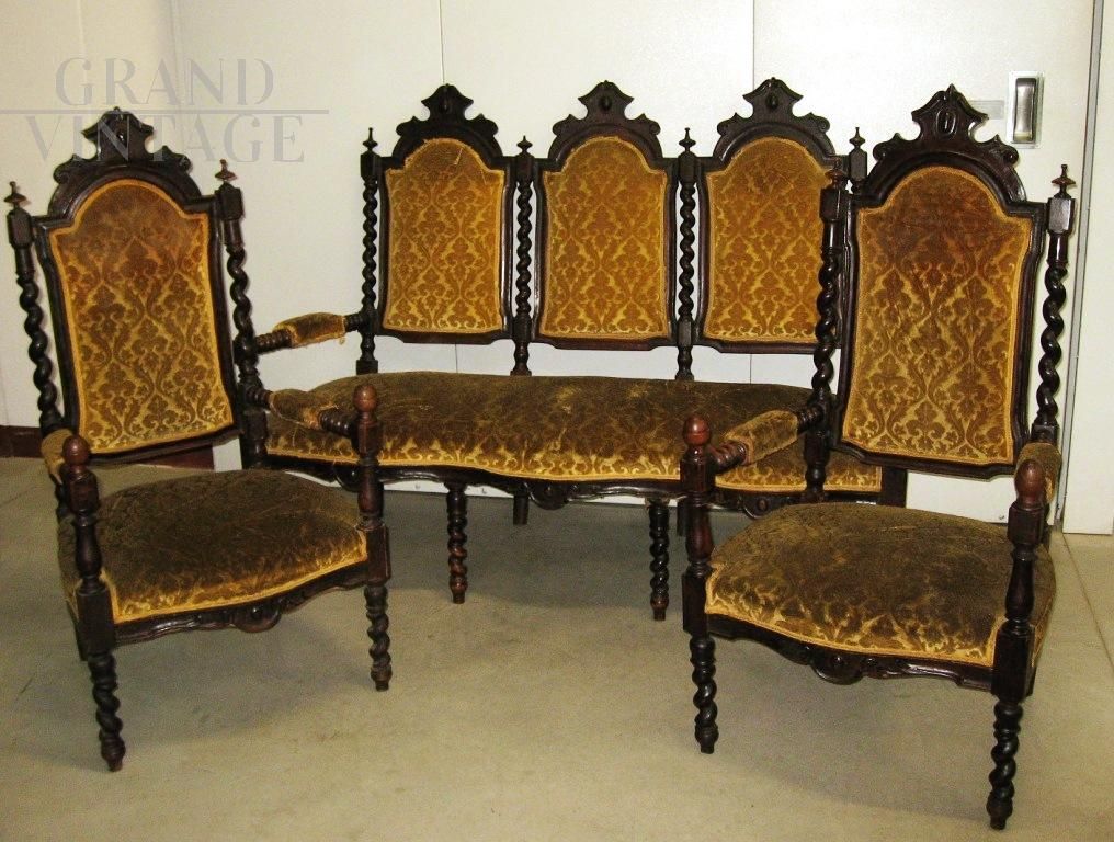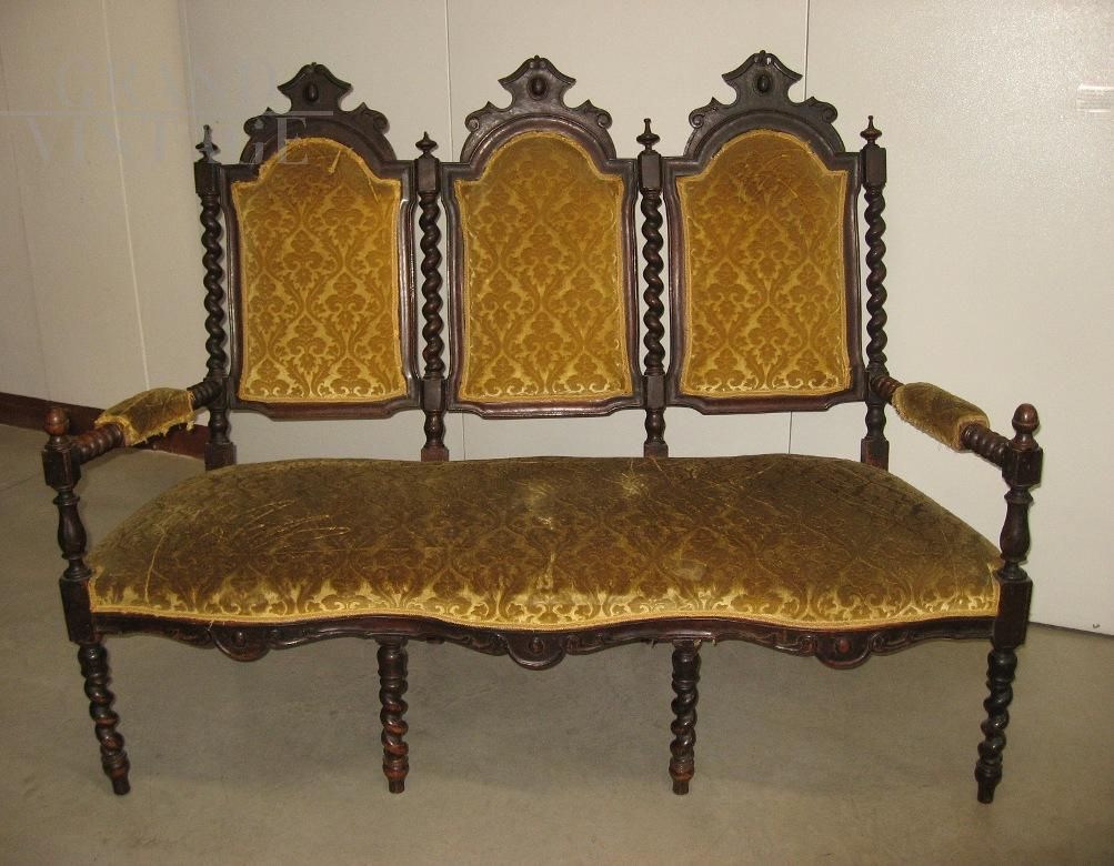 Divano e due poltrone antichi, epoca fine del 1800 inizi del 1900. Stile seicentesco, modello con torciglioni e intagli. Il salotto è in patina, NON RESTAURATO. Necessita intervento di restauro per utilizzo.