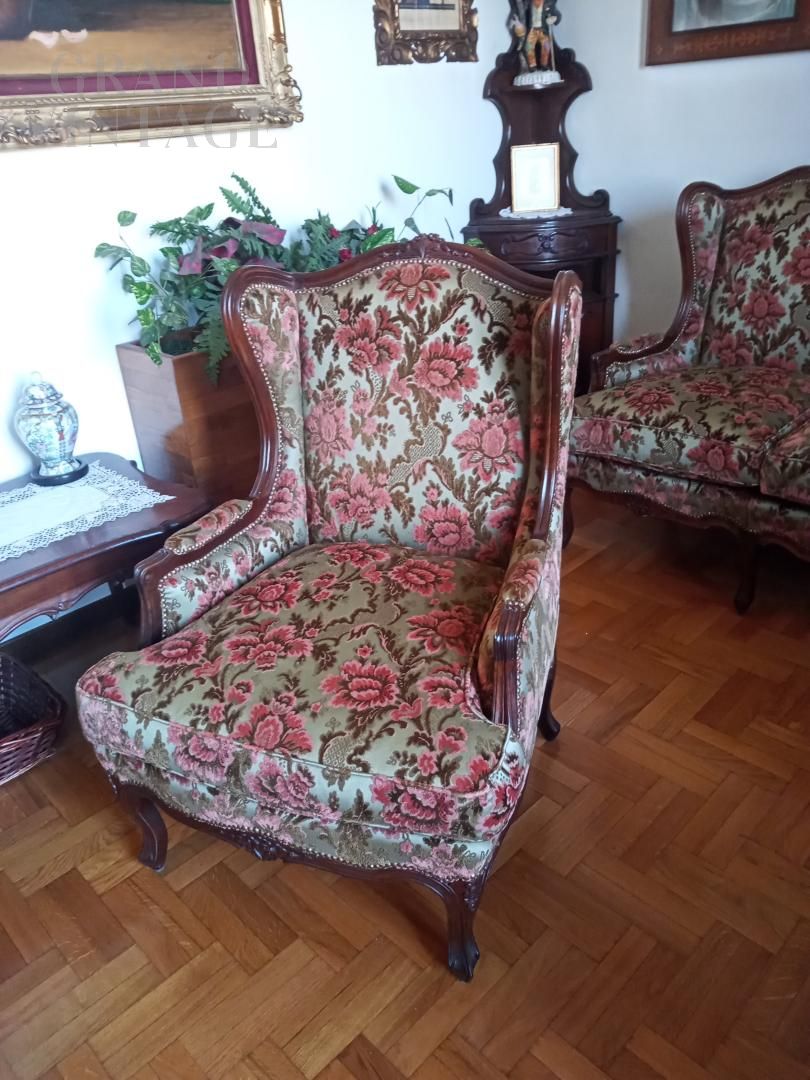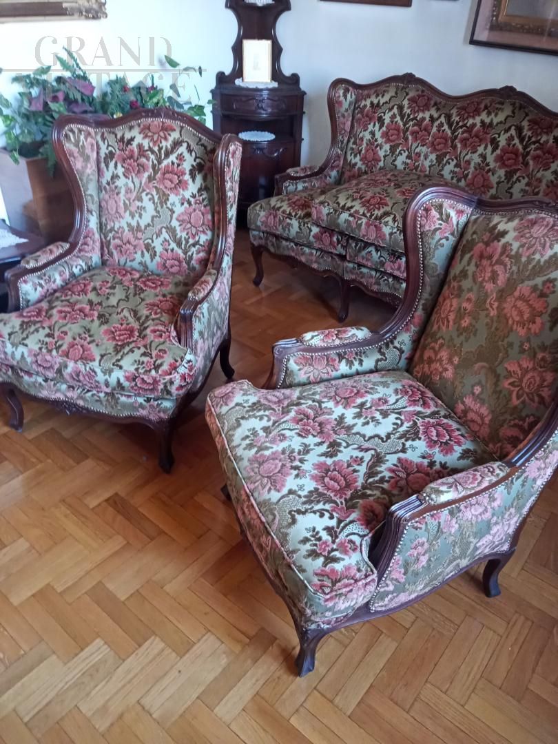 Elegante set da salotto Bergère in stile antico Luigi XV composto da un divano da 3 posti e due poltrone in legno noce massello, realizzato intorno alle metà del novecento in perfetto stile. Il set è rivestito con tessuto pregiato con rappresentazioni floreali, in perfette condizioni, sia l'imbottitura che il tessuto. Schienali e fianchi imbottiti, seduta con cuscini amovibili. La lavorazione artigianale dei dettagli in legno e la qualità dei materiali rendono questo set un pezzo di valore, perfetti per arredare con classe uno studio o un salotto.