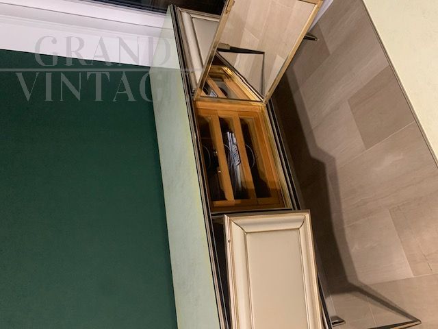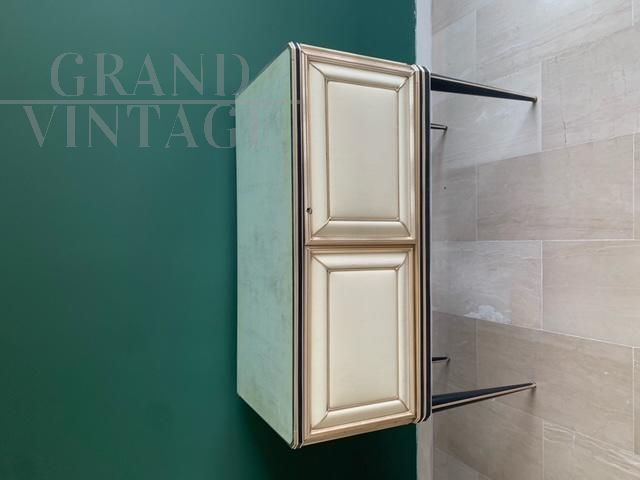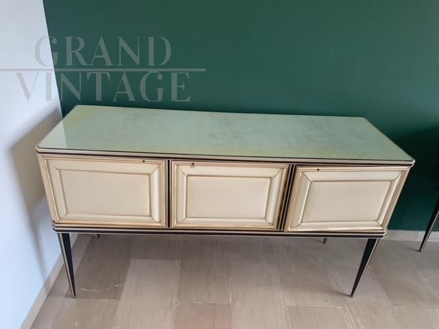 Salotto completo design dell'architetto Umberto Mascagni per Harrods, composto da un tavolo con piano in vetro verde di 140 x 80 cm, 6 sedie in skai bianco panna, una credenza madia e un mobile bar in legno bianco panna con piani in vetro verde. La credenza ha gli interni a specchio. Larghezza della credenza 160 cm, larghezza del mobile bar 110 cm.