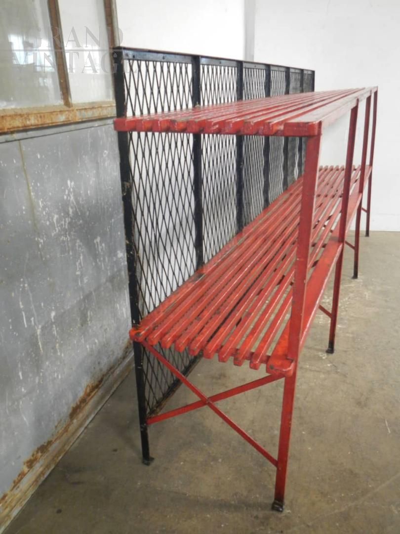 Scaffale industriale da officina vintage in abete laccato rosso e ferro, con griglia posteriore. I due ripiani a listelli hanno una larghezza di 45 cm. La distanza tra i ripiani è di 43 cm.