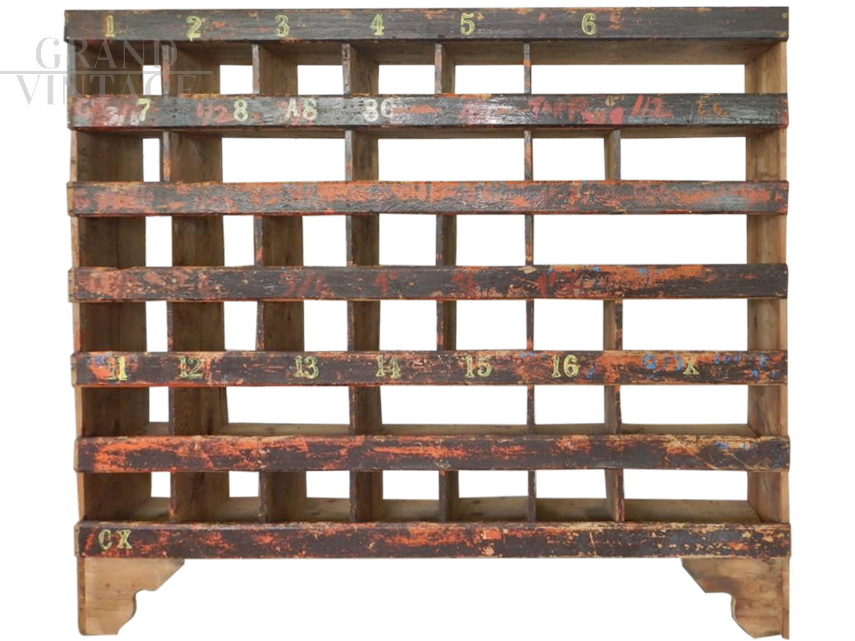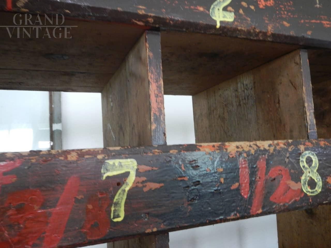 Scaffale industriale anni '70 in abete, in patina, restaurato e lavato.