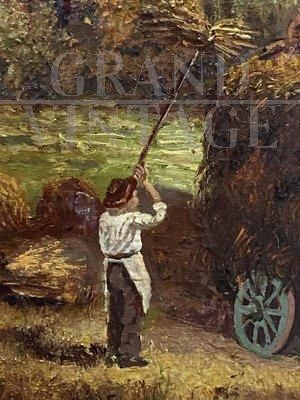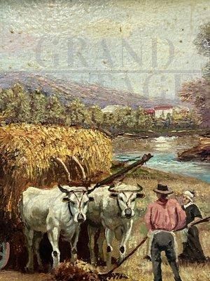 Dipinto con scena campestre raffigurante raccolta del fieno, scuola di Posillipo. Sullo sfondo un paesaggio campestre. Il quadro ispira un sentimento di tranquillità e dolcezza.