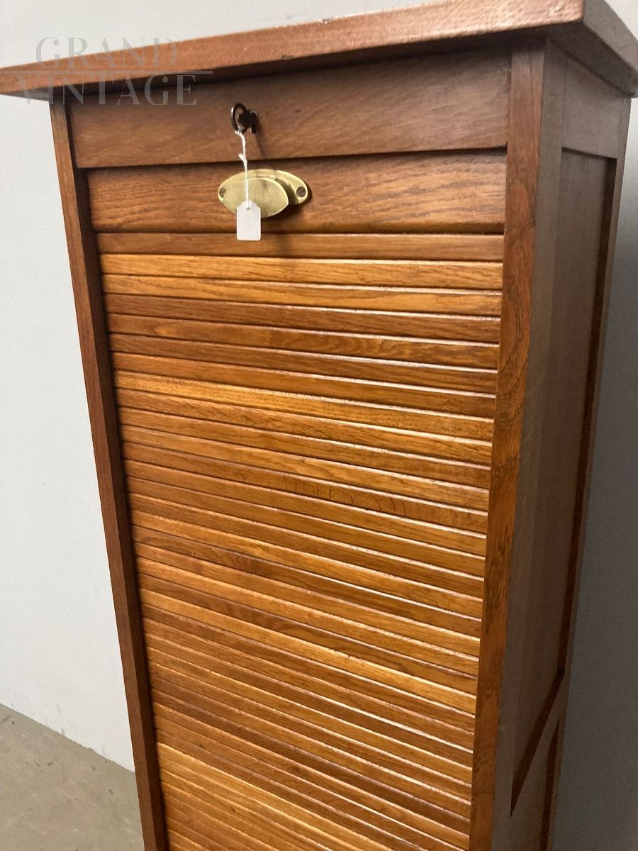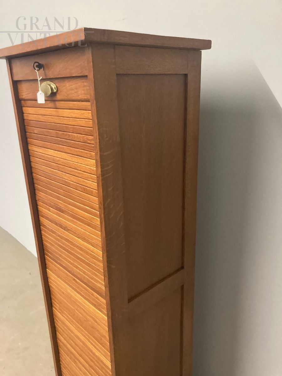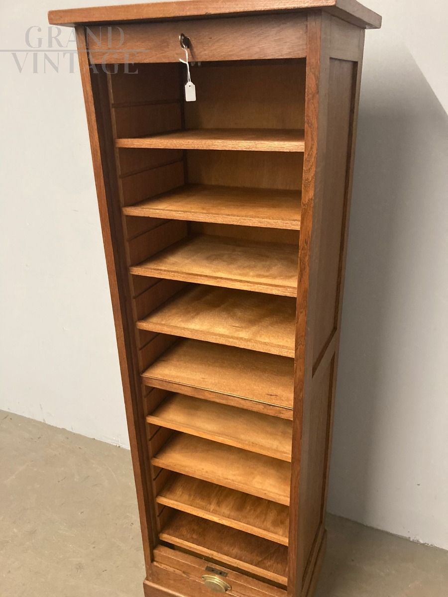 Classificatore vintage da ufficio a serrandina singola, modernariato anni '40, in rovere massello, perfettamente restaurata mantenendo il suo colore originale. Al suo interno, 8 ripiani removibili.