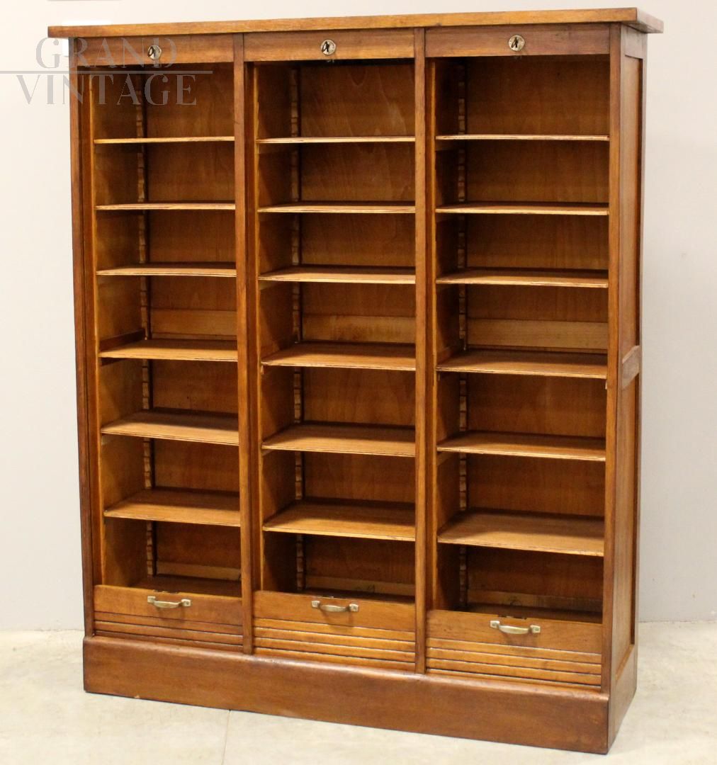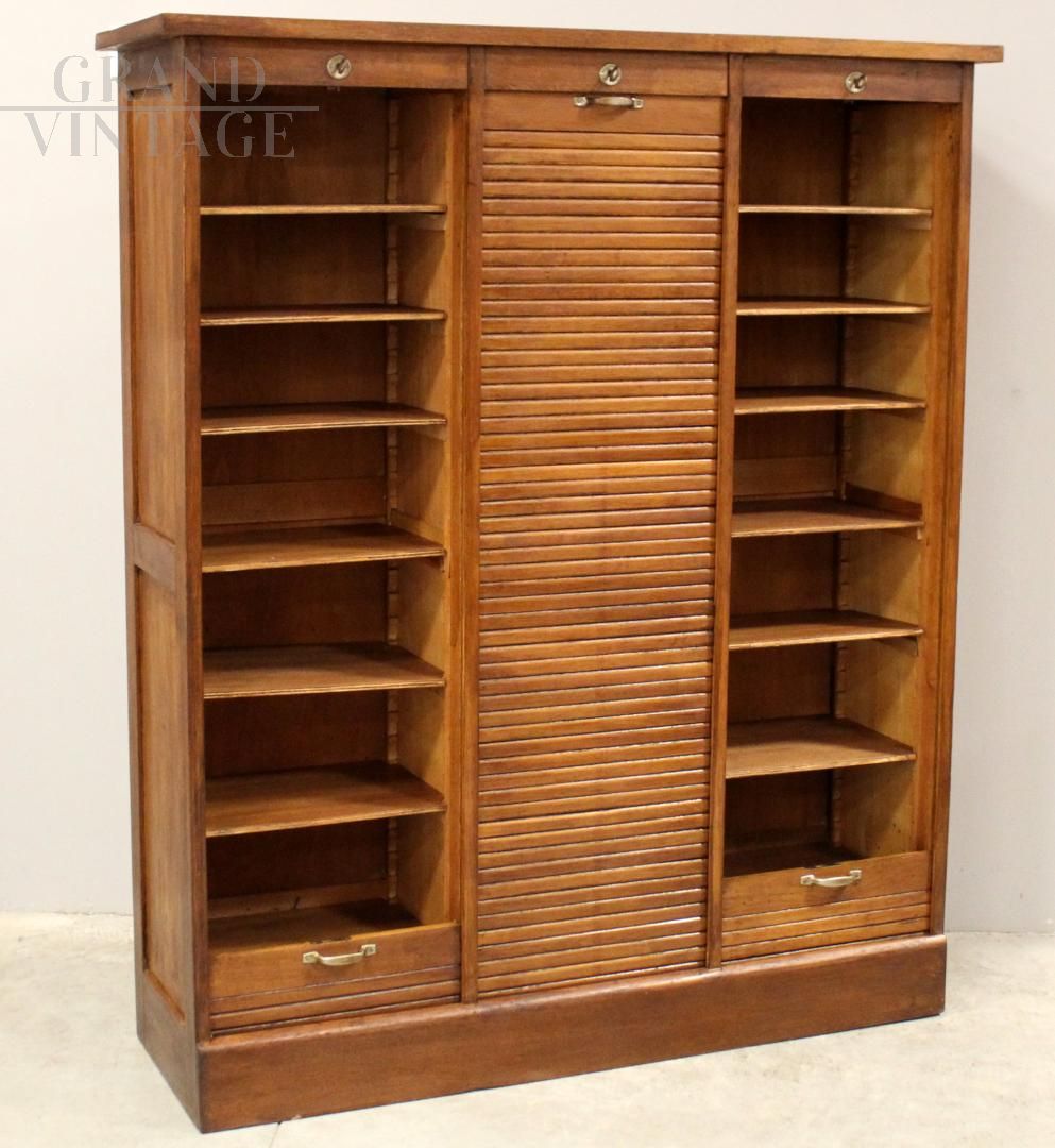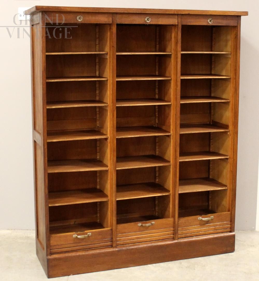 Libreria da ufficio classificatore da archivio a serranda tripla in rovere, epoca primi '900, restaurata.