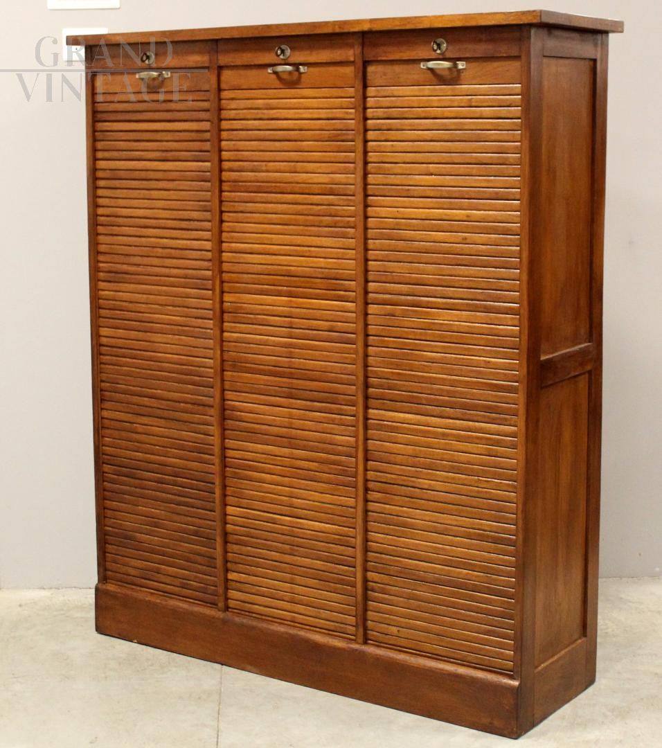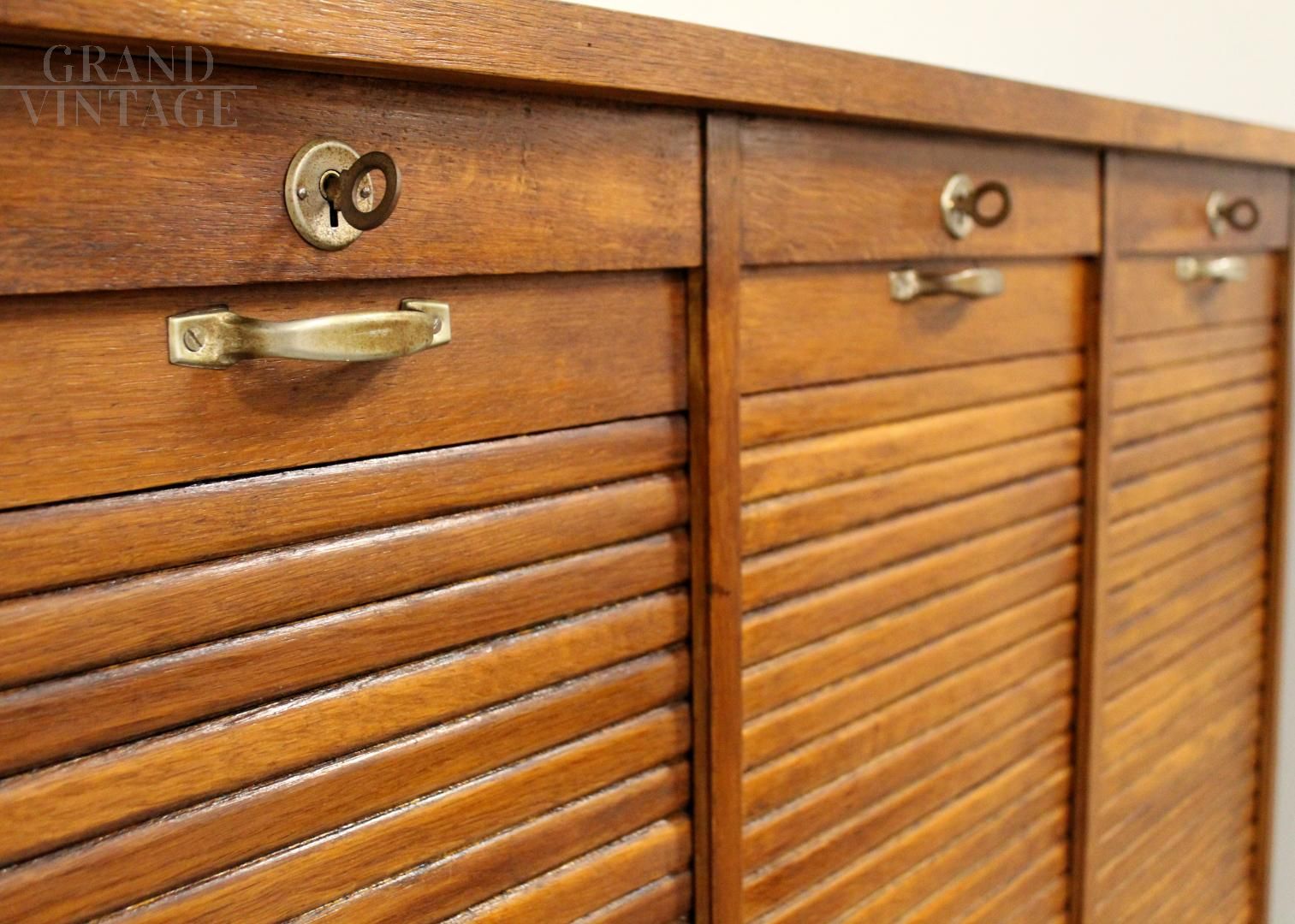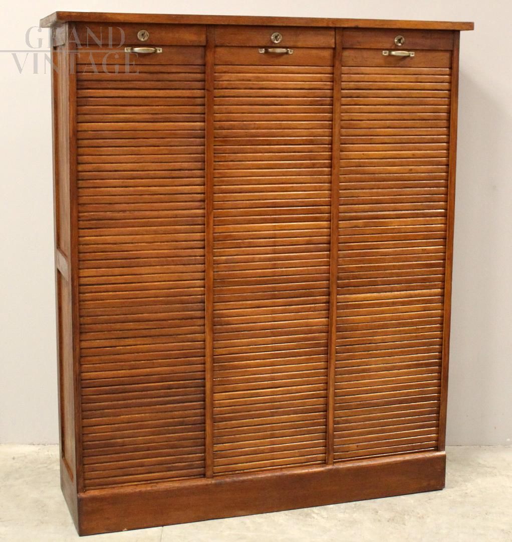 Libreria da ufficio classificatore da archivio a serranda tripla in rovere, epoca primi '900, restaurata.