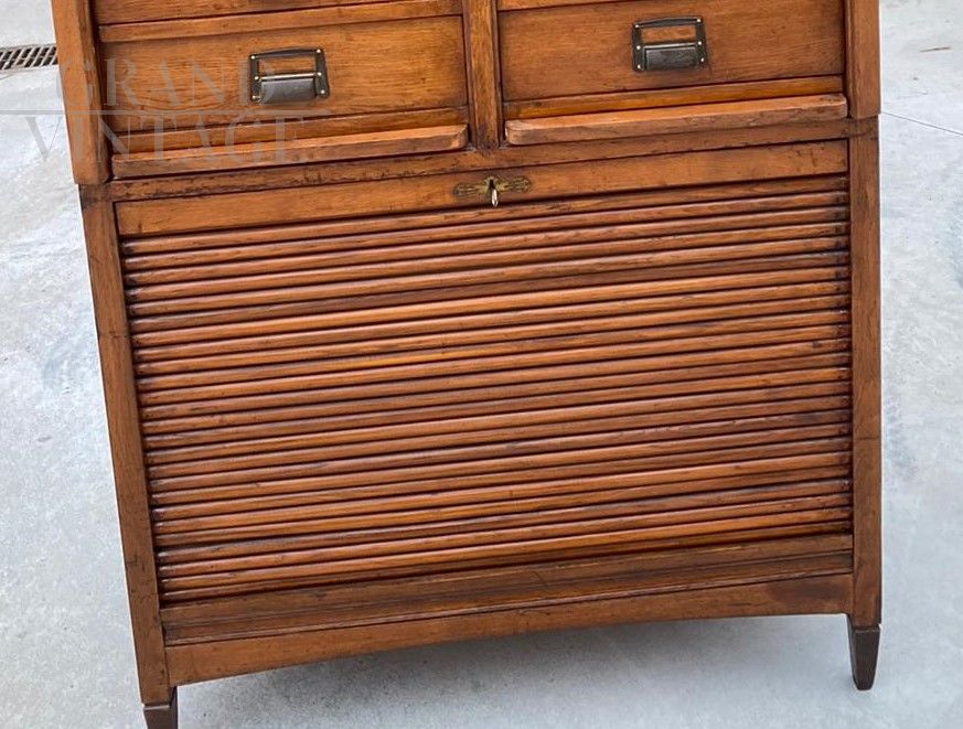 Mobile archivio schedario vintage in legno di rovere, la parte superiore è caratterizzata da 16 cassetti con frontale basculante, la parte inferiore è a serranda.