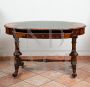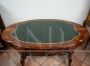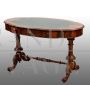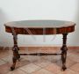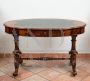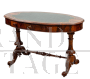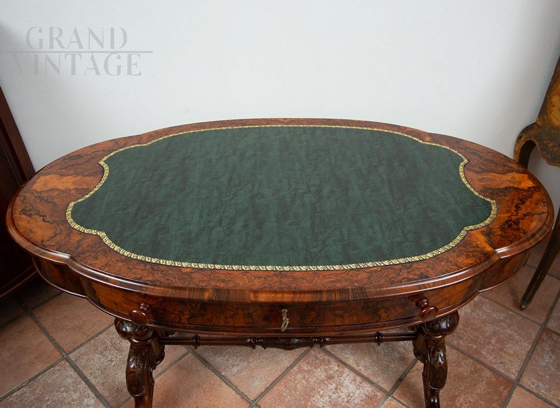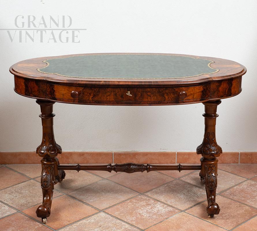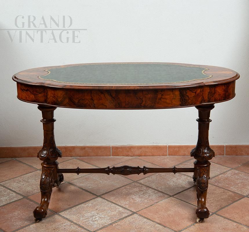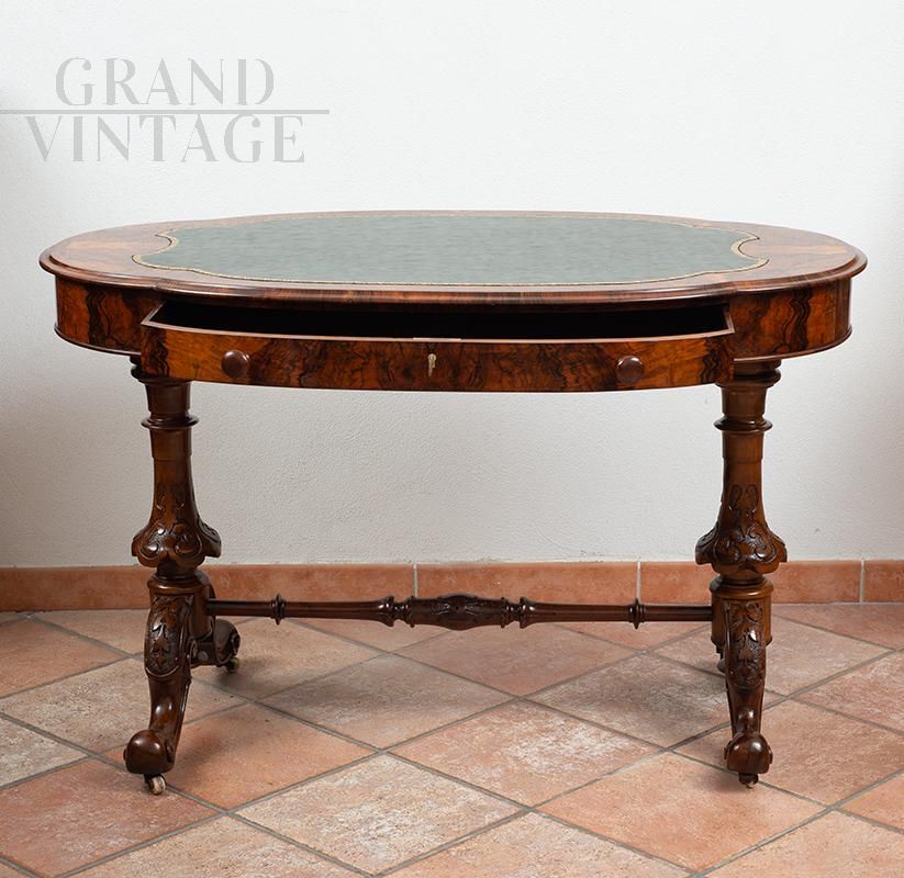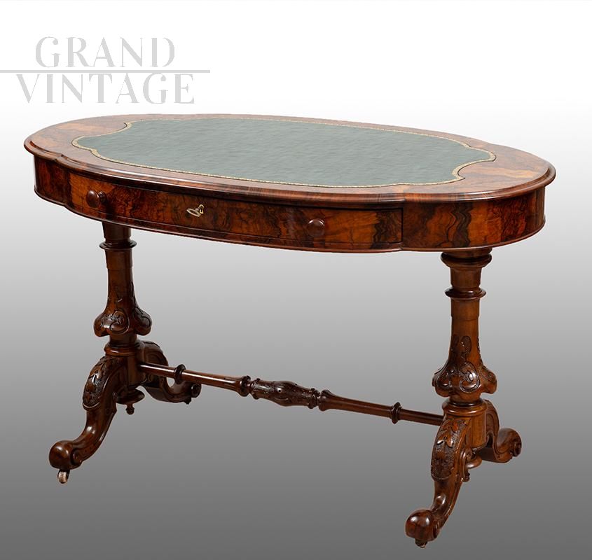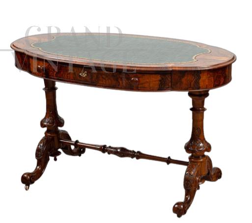 Scrittoio antico Vittoriano Inglese in radica di noce. Il piano di forma ovale presenta una pelle centrale contornata da un bordino in oro 24kt. La fascia sottopiano è caratterizzata da un unico cassetto estraibile tramite un pomello in legno. I piedi a cabriolet poggiano su delle rotelle in porcellana coeve allo stesso, e sono collegati tramite una traversa finemente intagliata. La fascia sottopiano risulta essere speculare a quella principale.