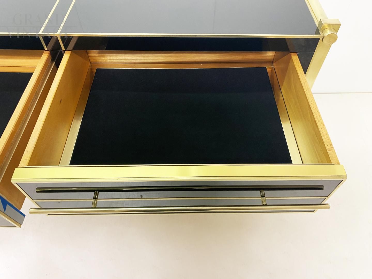 Scrittoio consolle vintage in vetro nero e ottone, anni '70