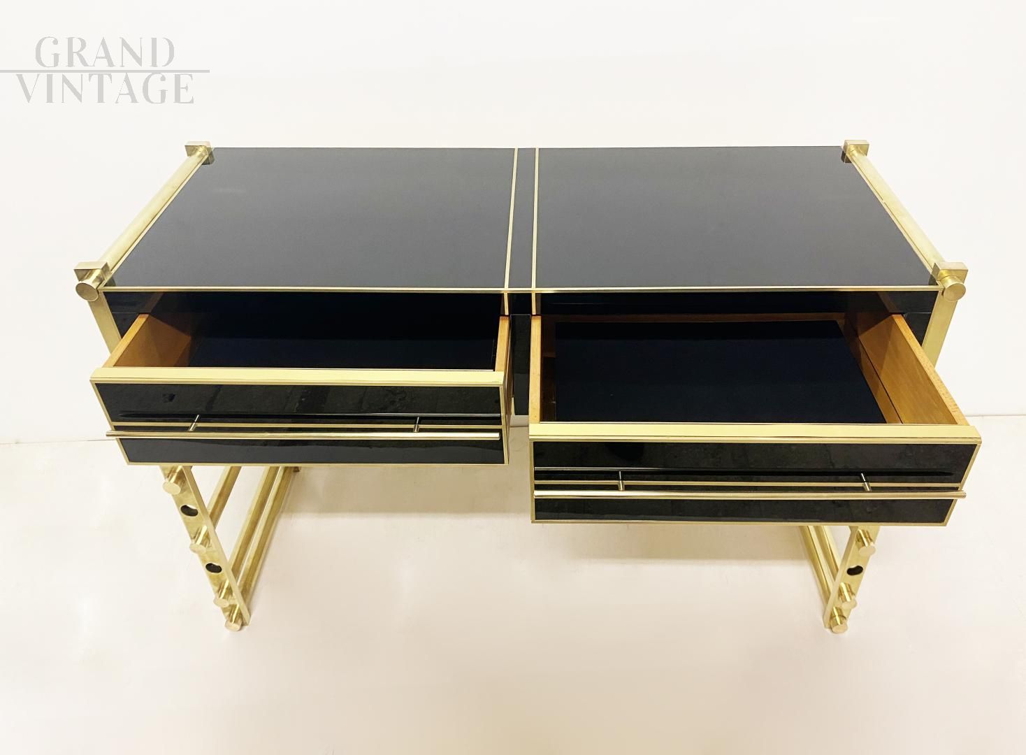 Elegante scrittoio consolle design modernariato in vetro nero con gambe in ottone, interni in legno ebanizzato con bordature in ottone. Provenienza: Italia anni '70. Disponibile la coppia.