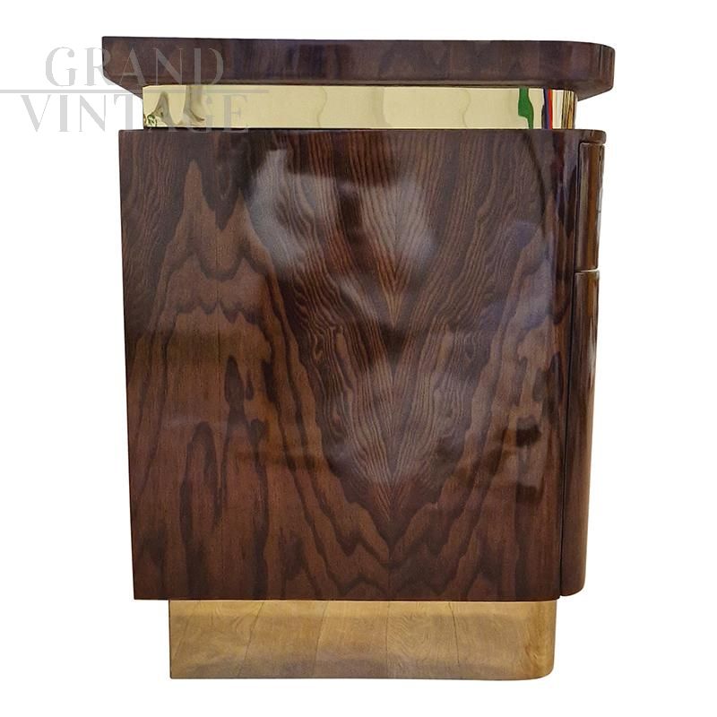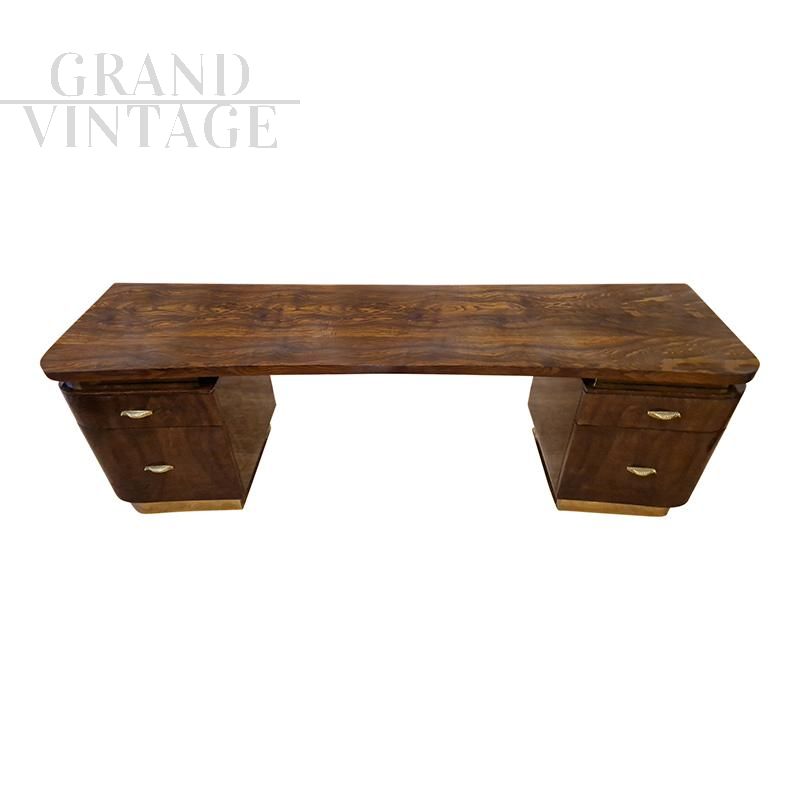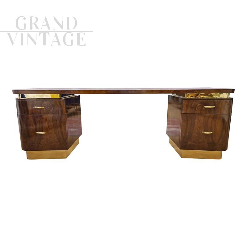 Scrivania direzionale con struttura multistrato rivestita con impiallacciatura in radica di mogano, dotata di quattro cassetti, maniglie in ottone dorato, zoccolo e fasce sottopiano in acciaio dorato.