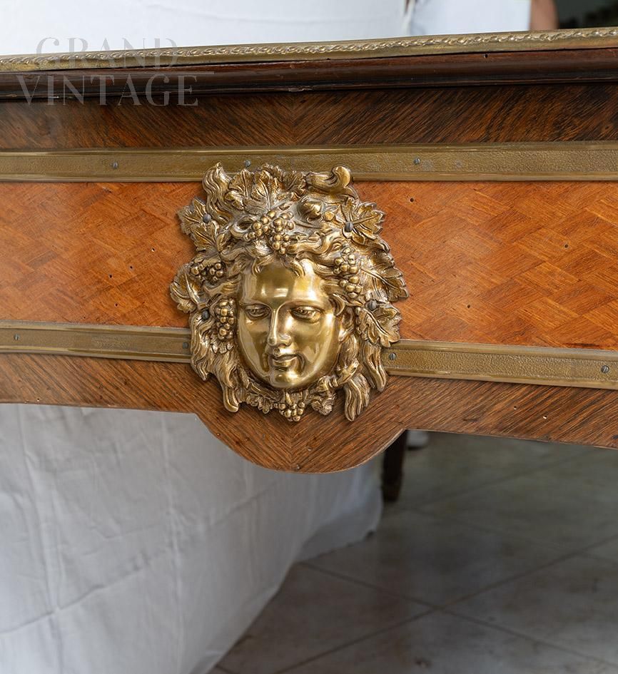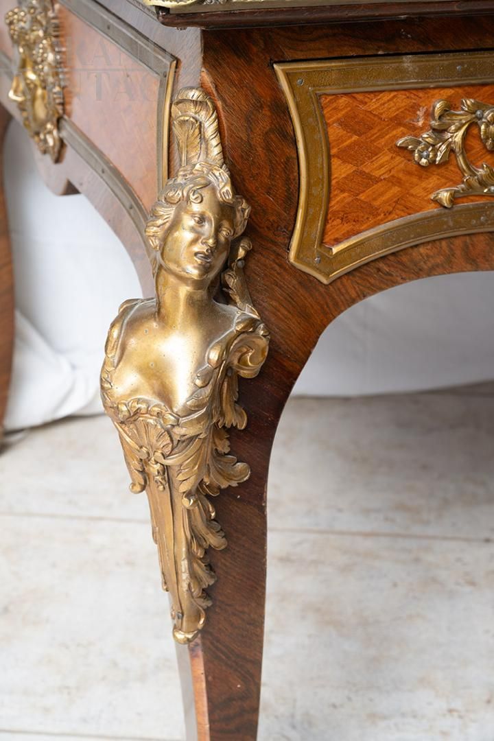 Scrivania antica Napoleone III Francese in legno esotico pregiato con applicazione in bronzo dorato finemente cesellato. Il piano presenta un rivestimento in pelle cesellata originale dell'epoca contornata da una bordatura in bronzo dorato. Il fronte è scandito da tre cassetti impreziositi da bocchette e maniglie a motivo fogliaceo in bronzo dorato. I quattro cantoni sono ornati da grandi figure di donne a mezzo busto tipico del periodo di appartenenza. I laterali sono contornati come il fronte con dei profili in bronzo a motivo fogliaceo con al centro un mascherone. La faccia opposta risulta essere speculare a quella principale. Gli interni risultano essere in legno di rovere.