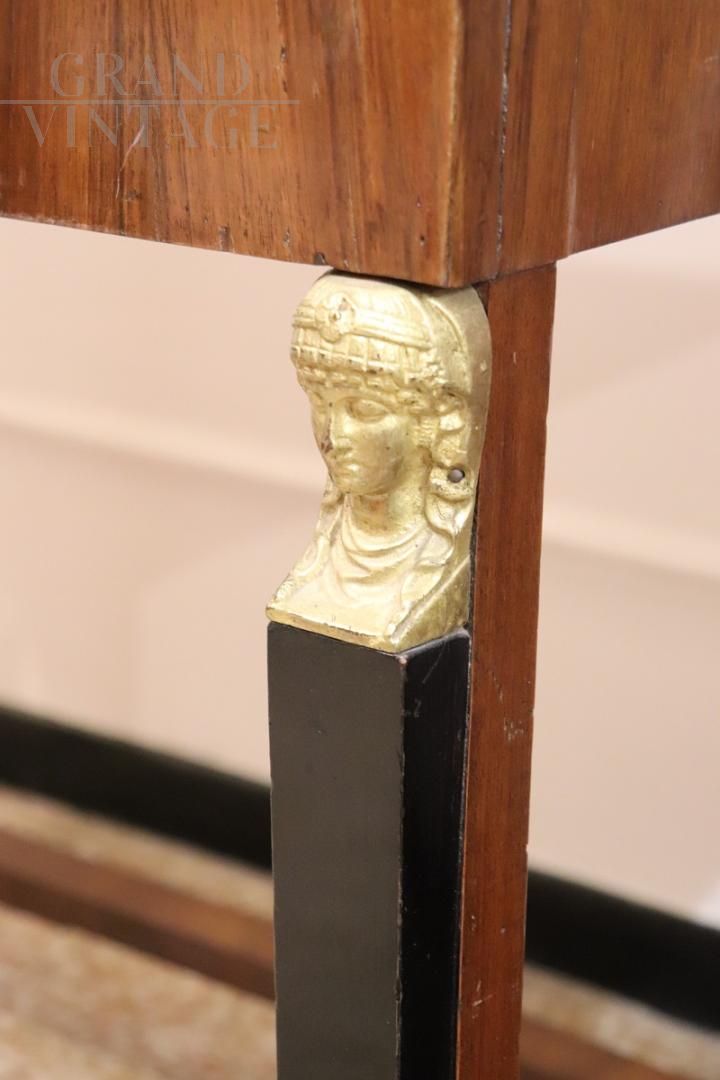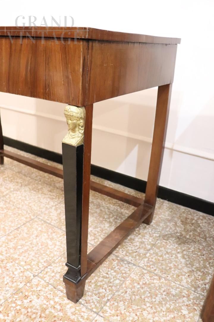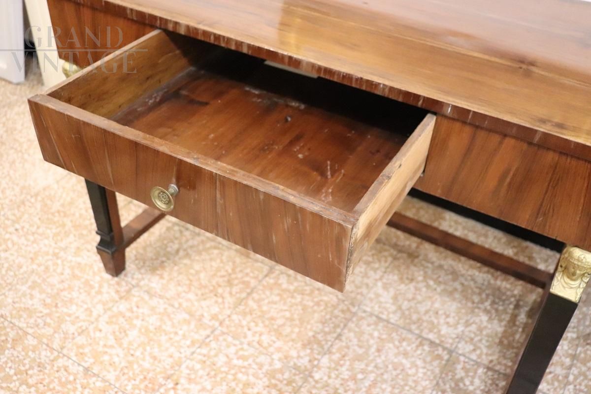 Scrivania antica italiana risalente ai primi anni del XIX secolo, durante il sontuoso periodo Impero. Questa scrivania, realizzata in noce pregiato, è caratterizzata da una raffinata linearità. Sul fronte, due lesene nere con un capitello a cariatide in bronzo finemente dorato creano un accento visivo che cattura l'attenzione e aggiunge un tocco di lusso. Dal punto di vista pratico, è presente un cassetto per riporre piccoli oggetti e una superficie ampia abbastanza per essere perfetta per svolgere lavoro da ufficio in casa. Si noti che questa scrivania è stata progettata per essere collocata contro una parete; il retro è in legno grezzo. spazio disponibile dal pavimento per le vostre gambe è di 60 cm. Prezzo trattabile.