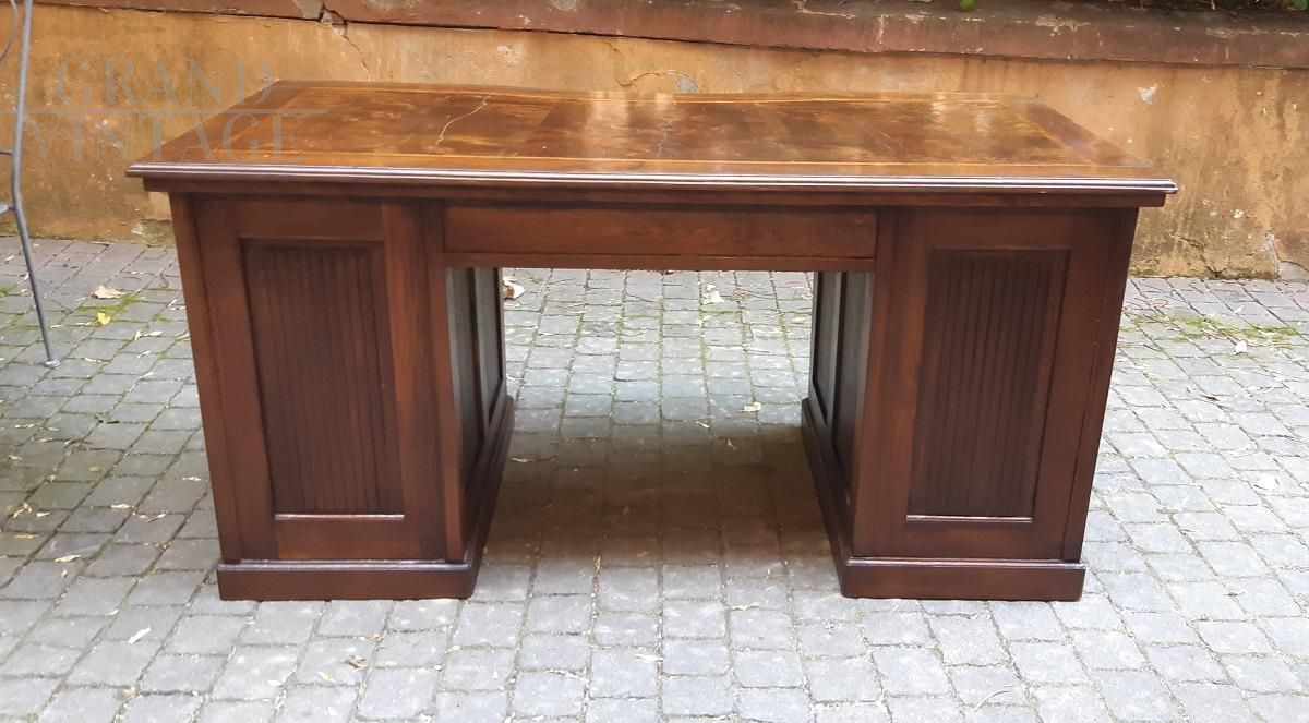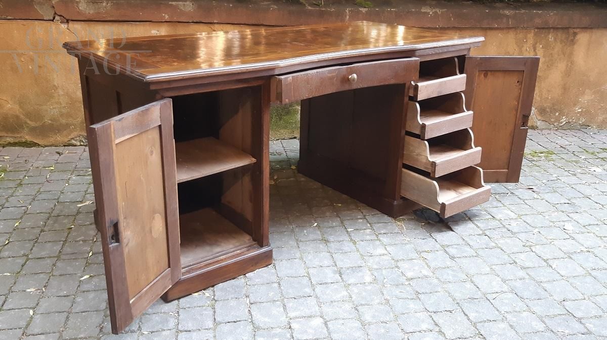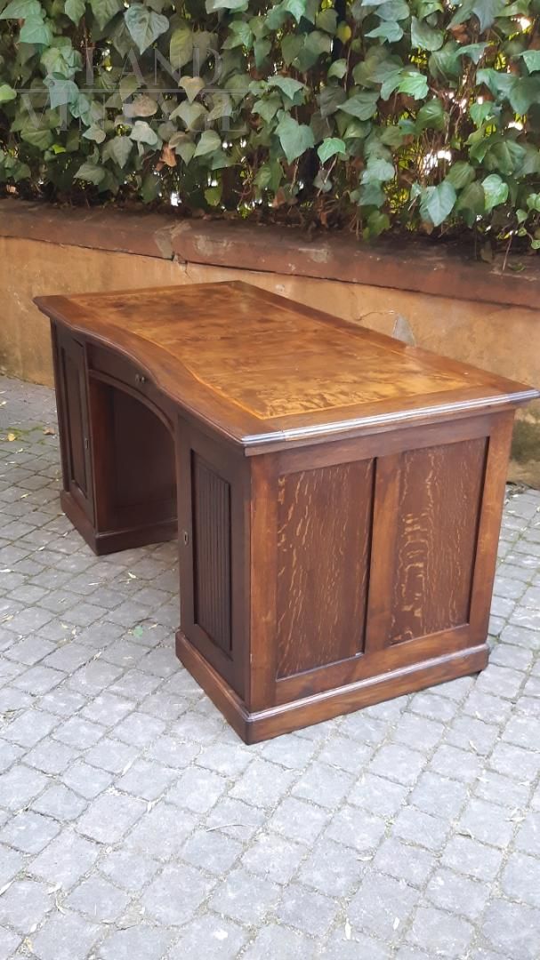 Scrivania lombarda antica da centro dell'800 in legno di rovere con piano in radica di gattice e vani capienti ai lati, di cui uno con cassetti estraibili. Curiosa scrivania dal disegno articolato, che va ad offrire, all'interno dello sportello di sinistra, un ampio spazio a ripiano, e 4 pratici cassetti all'interno dello sportello lato destro. Il piano filettato e radicato le dona importanza e le modanature a canne d'organo sulle pannellature la caratterizzano, mentre l'accogliente postazione a mezzaluna rientrante la distingue dalla moltitudine.