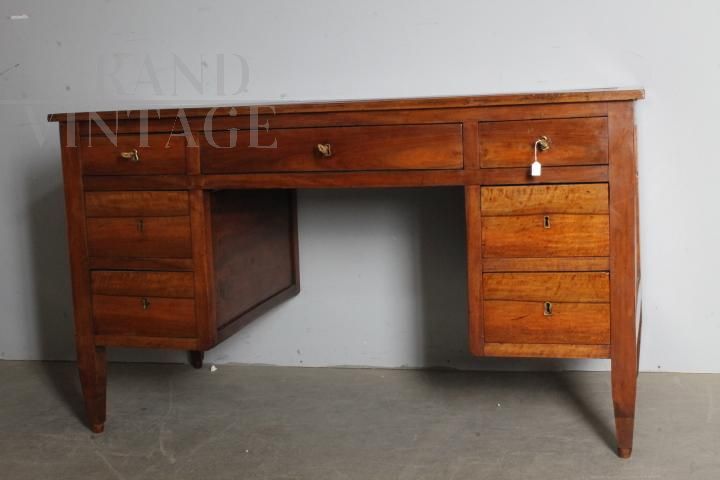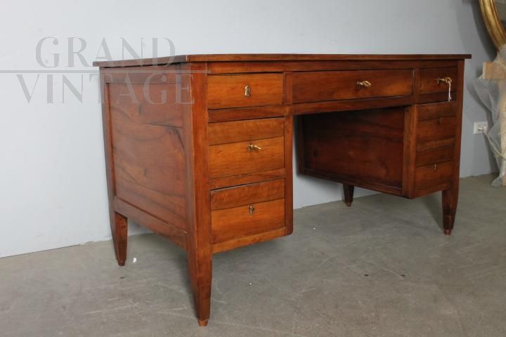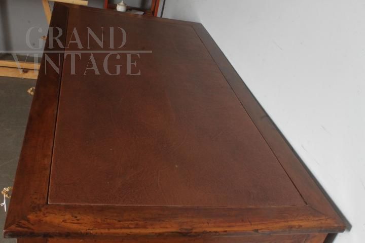 Antica scrivania Lombarda da centro stanza in noce massello, realizzata intorno al 1770 - epoca Luigi XVI, completa di piano in pelle e 7 cassetti con serrature antiche. Elegante e di grande qualità, completamente restaurata con finitura a cera d’api.