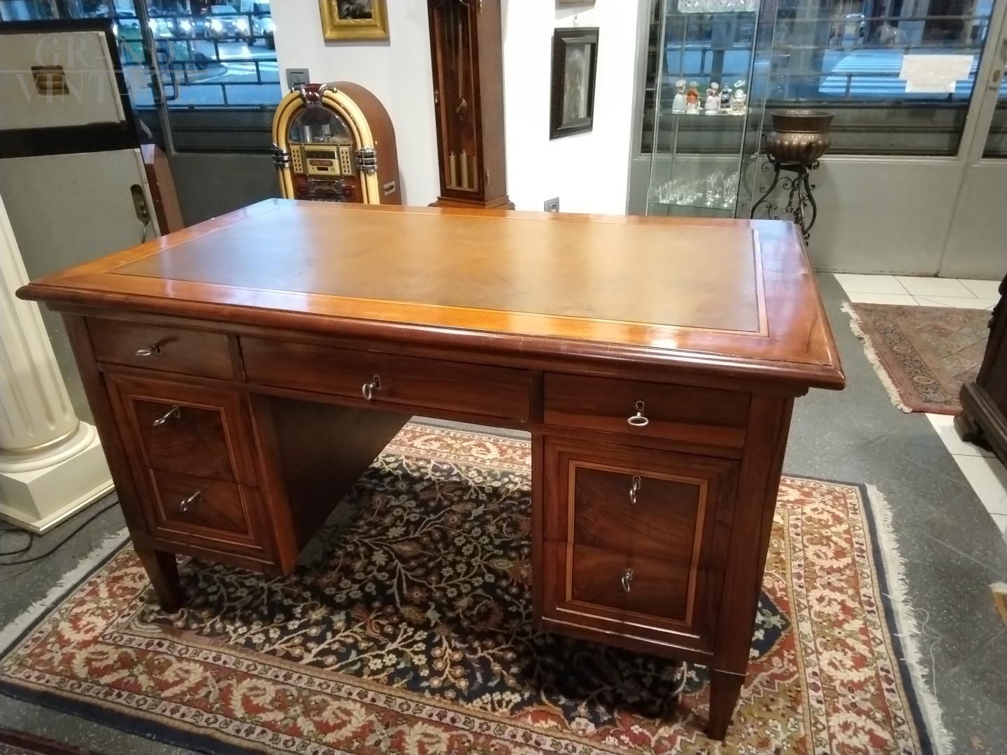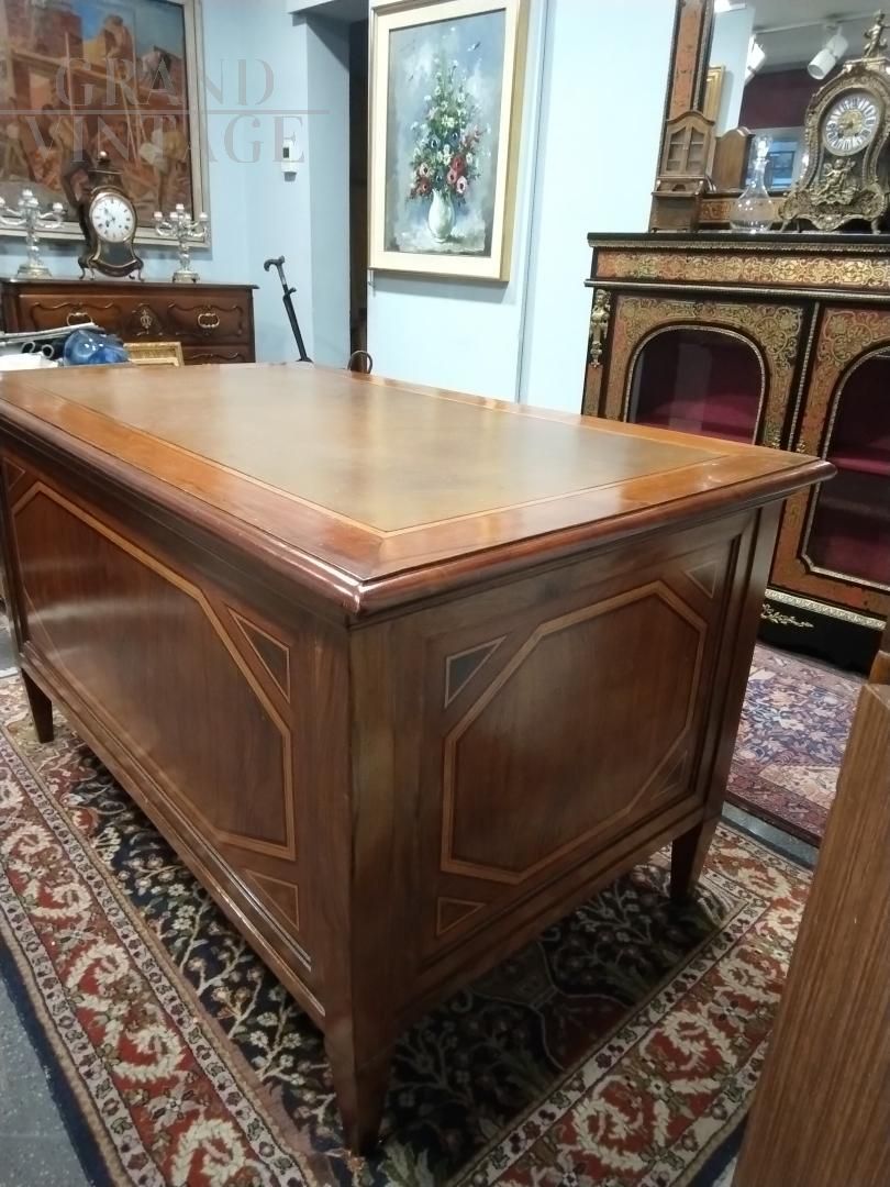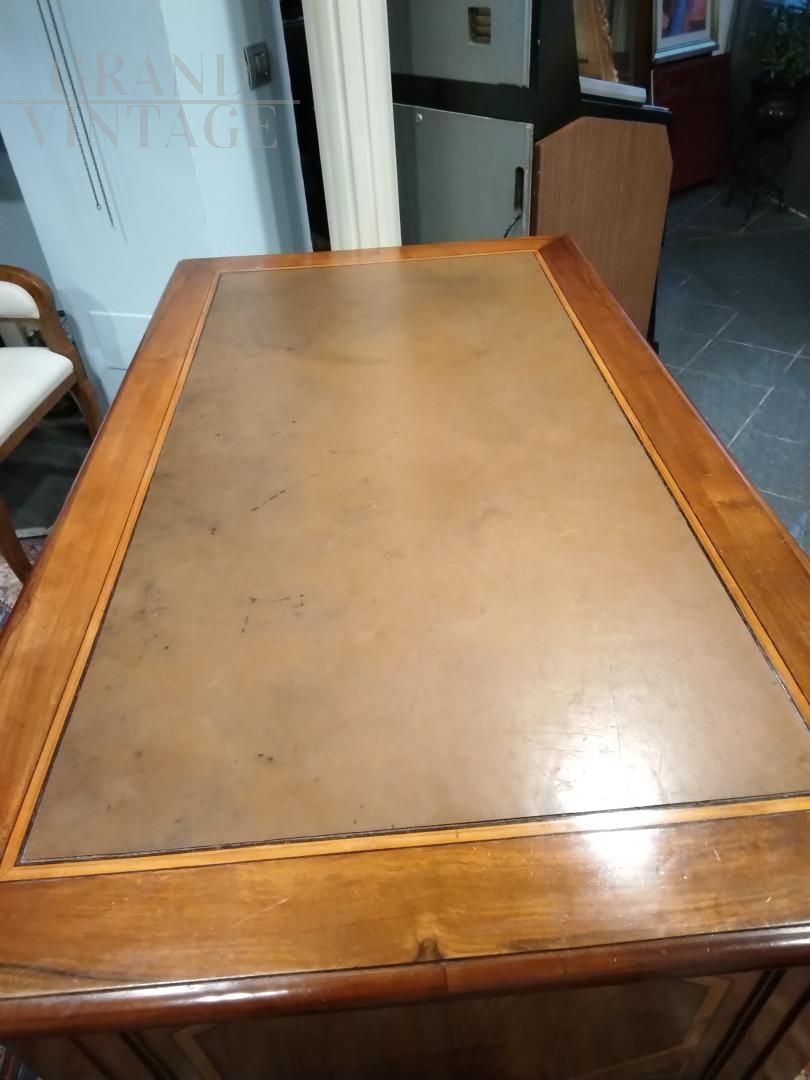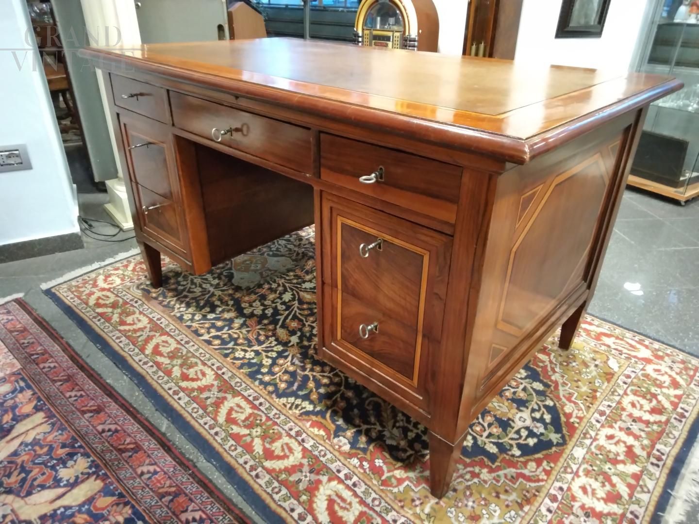 Scrivania antica lombarda del XVIII secolo in legno noce intarsiato con filetti in acero, cassetti in legno noce, serrature originali funzionanti e piano rivestito in cuoio originale. Restaurata.