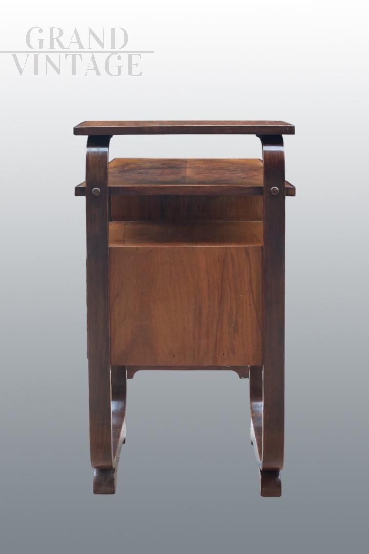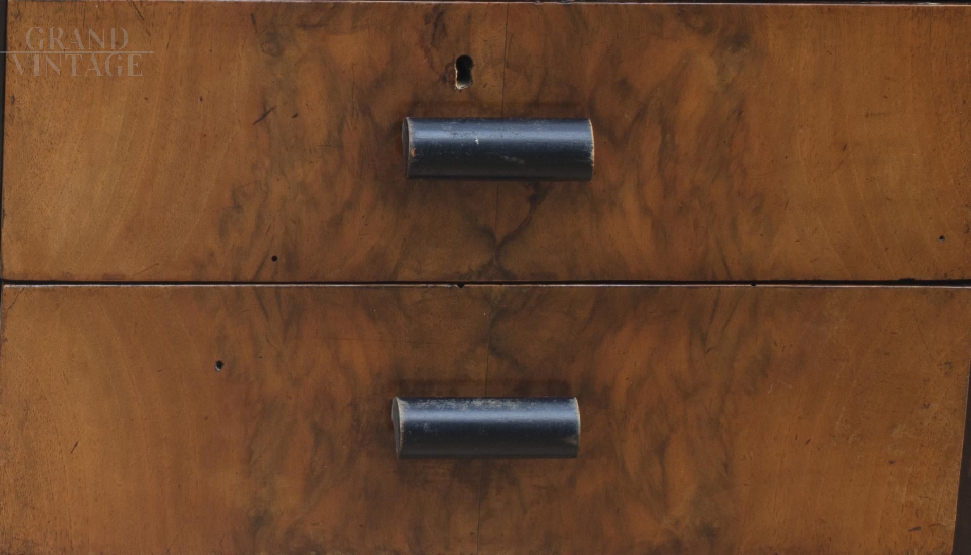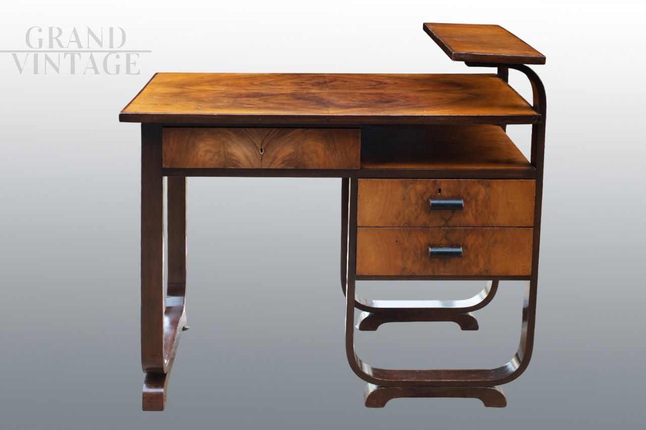 Scrittoio scrivania Art Déco anni ‘30 impiallacciato in noce con rialzo sul piano, le maniglie sono ebanizzate e le gambe hanno una bellissima forma curva. Totalmente restaurata, la scrivania ha le chiavi mancanti.