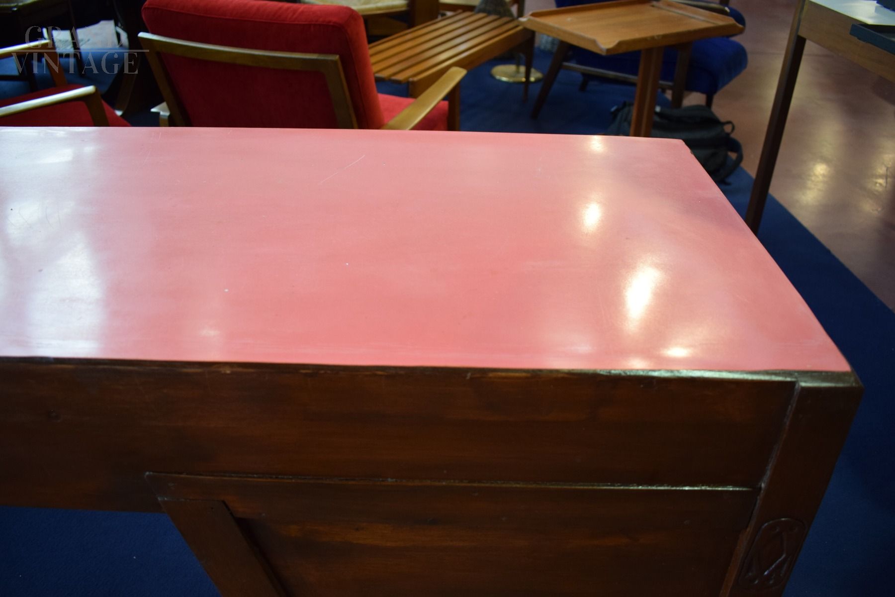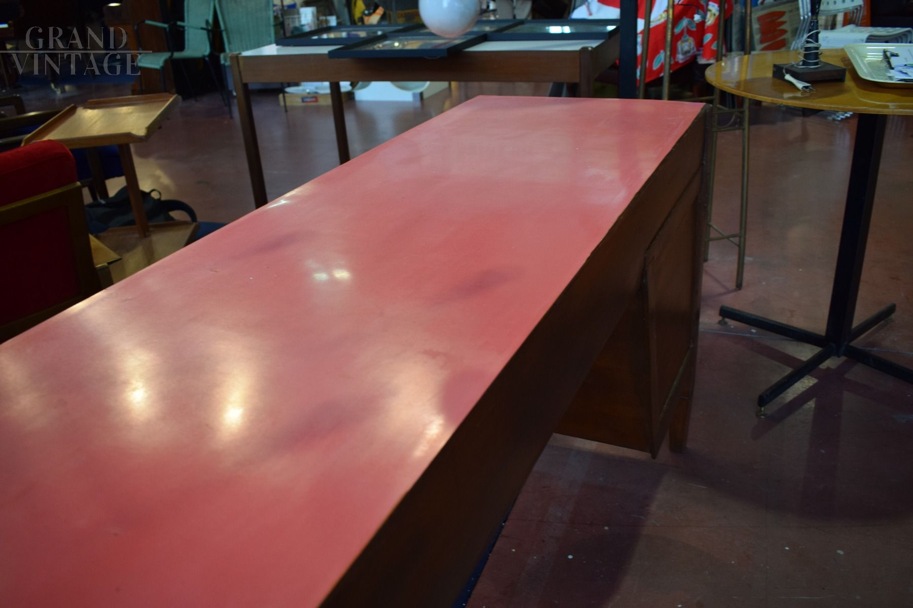 Lavorata anche sul davanti, è prodotta in legno di rovere e ha un elegante ripiano in formica rosa.