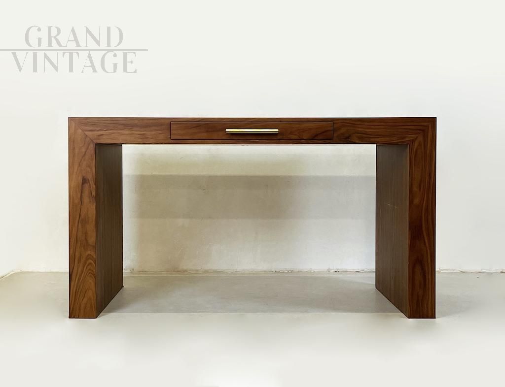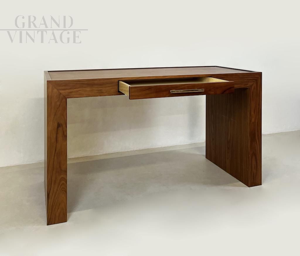 Particolare scrivania o consolle contemporanea in stile Art Déco anni '30 realizzata in legno di noce dalle bellissime venature, dotata di un cassetto centrale con maniglia in ottone. Si tratta di una nuova realizzazione in stile.
