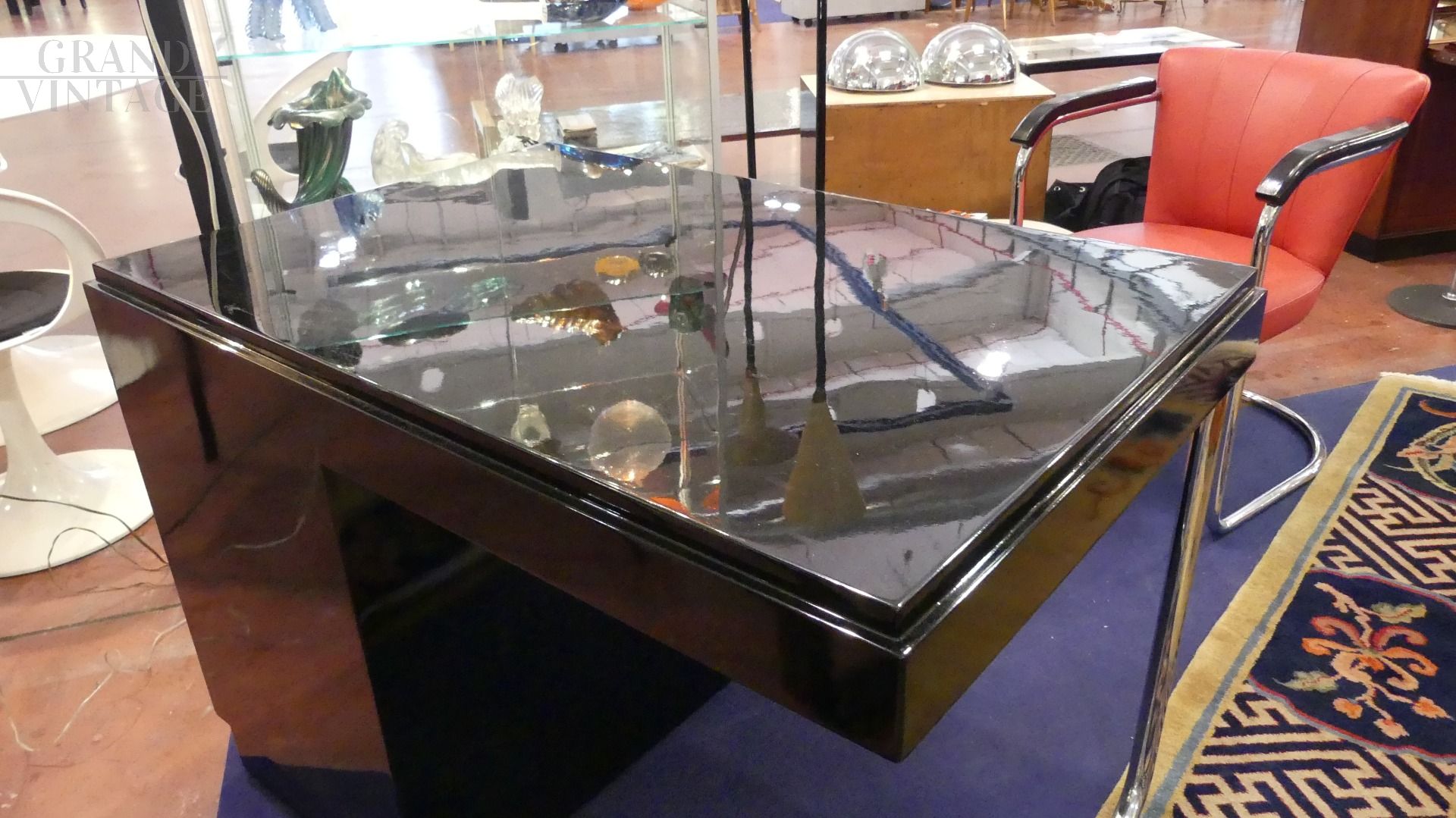 Scrivania mid century - art déco anni '40 in legno ebanizzato nero con base in acciaio, in ottime condizioni, laccata a nuovo.