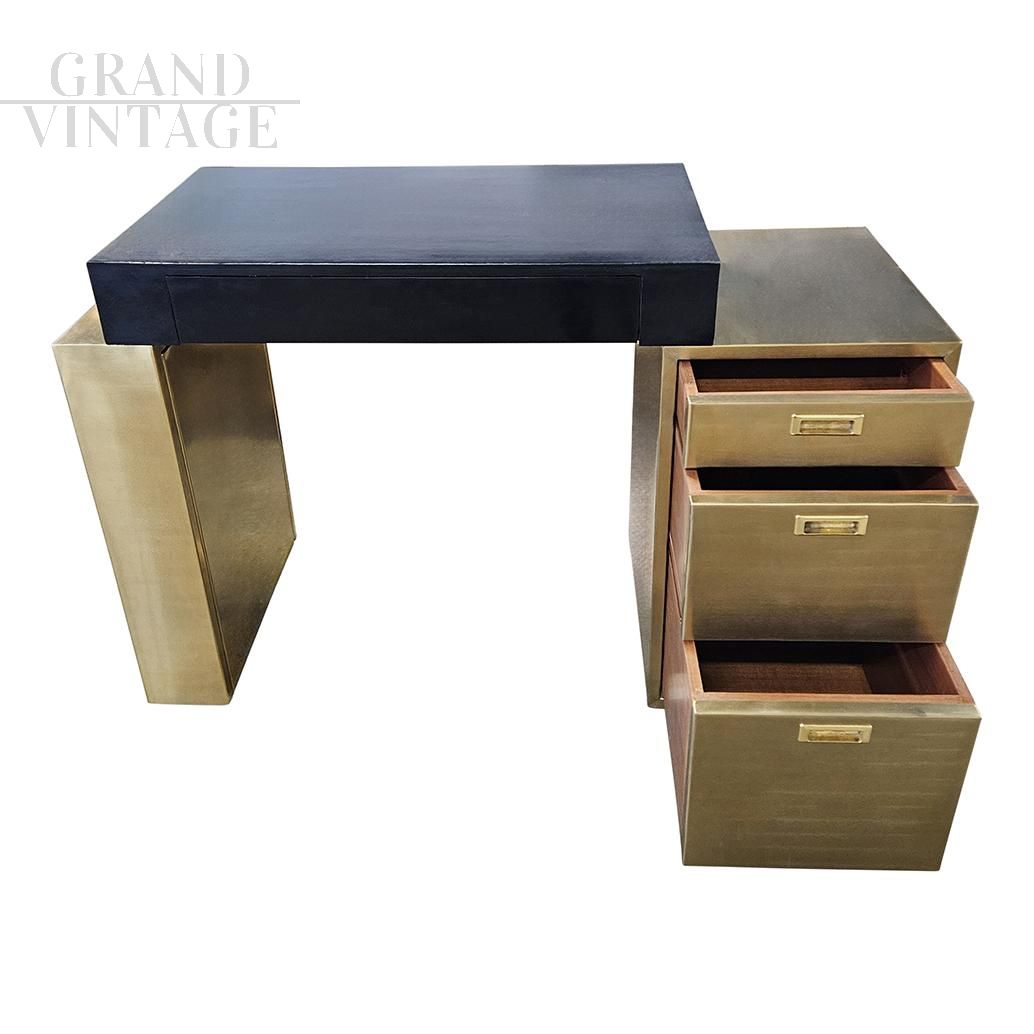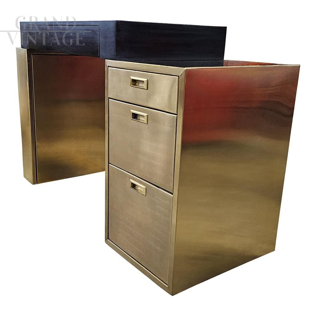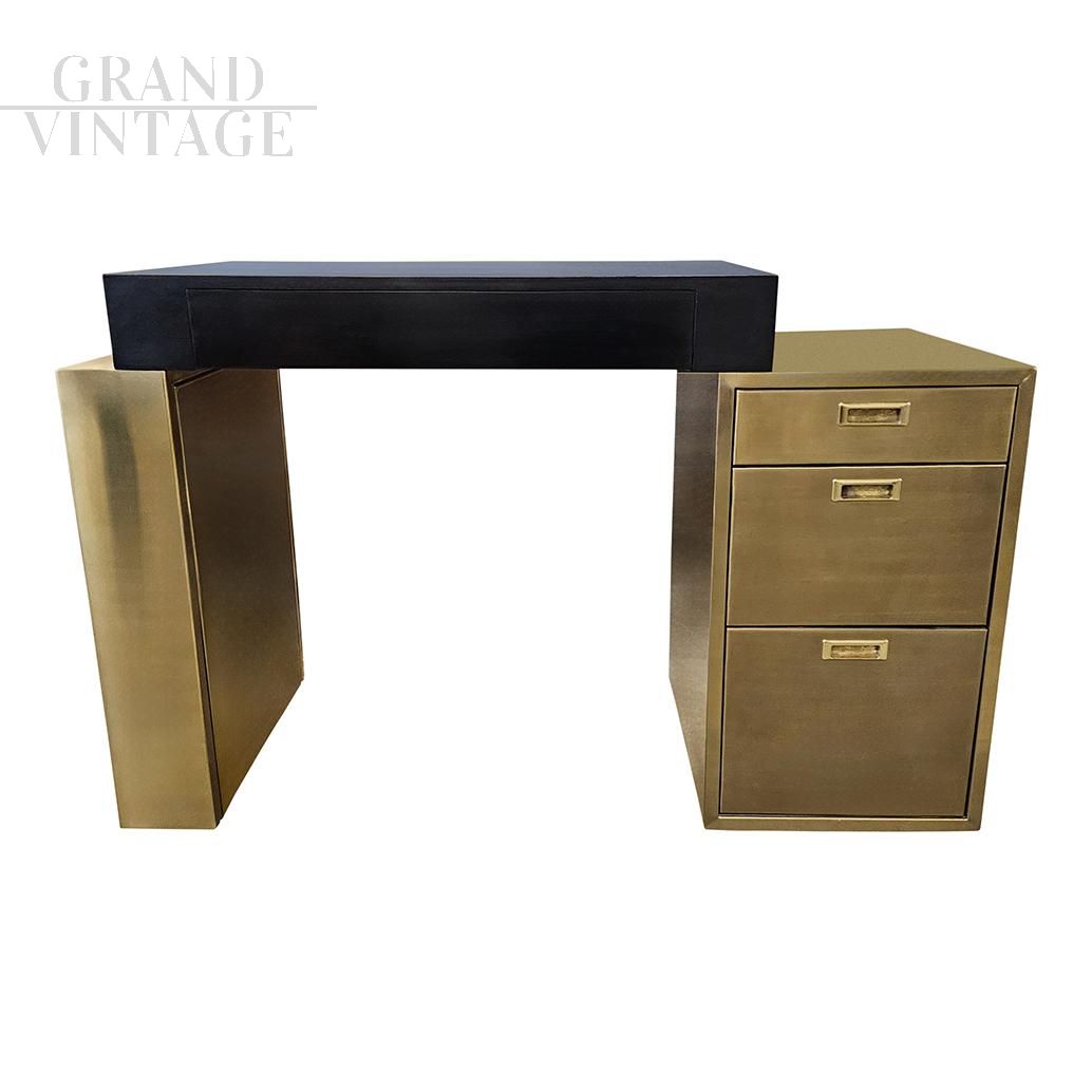 Scrivania design in ottone e legno nero con cassettiera