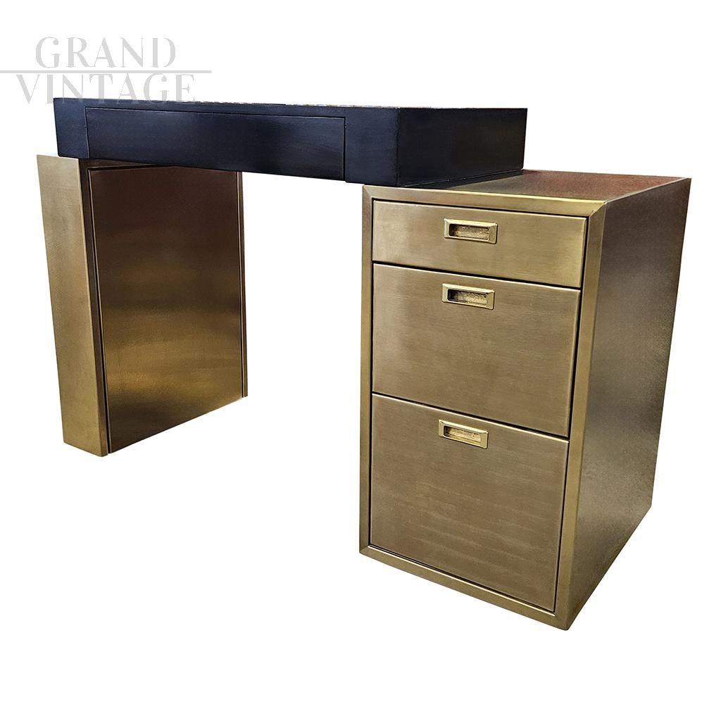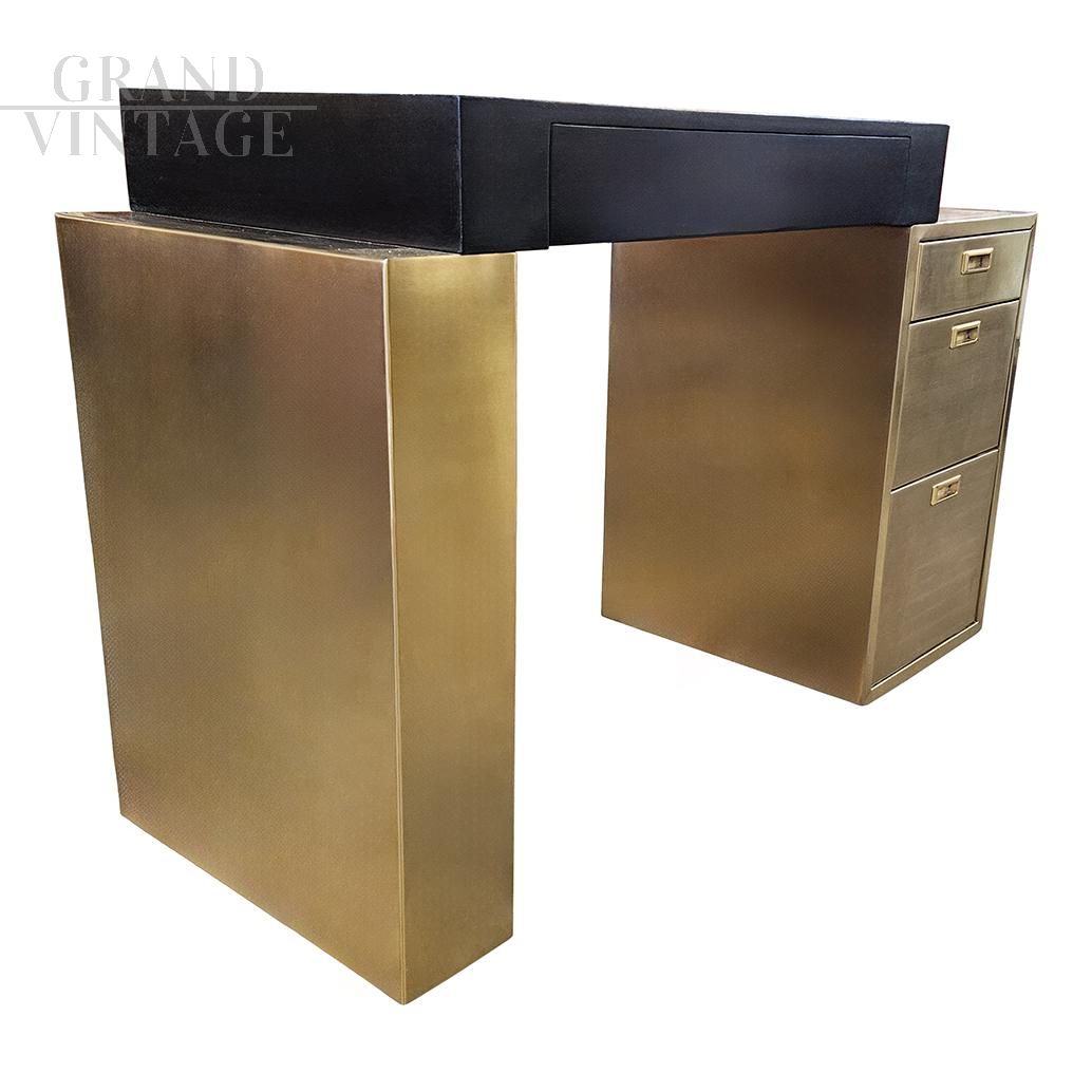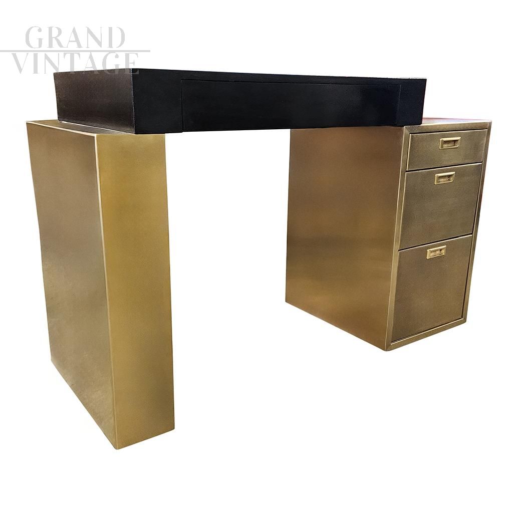 Scrivania design in ottone e legno nero con cassettiera