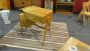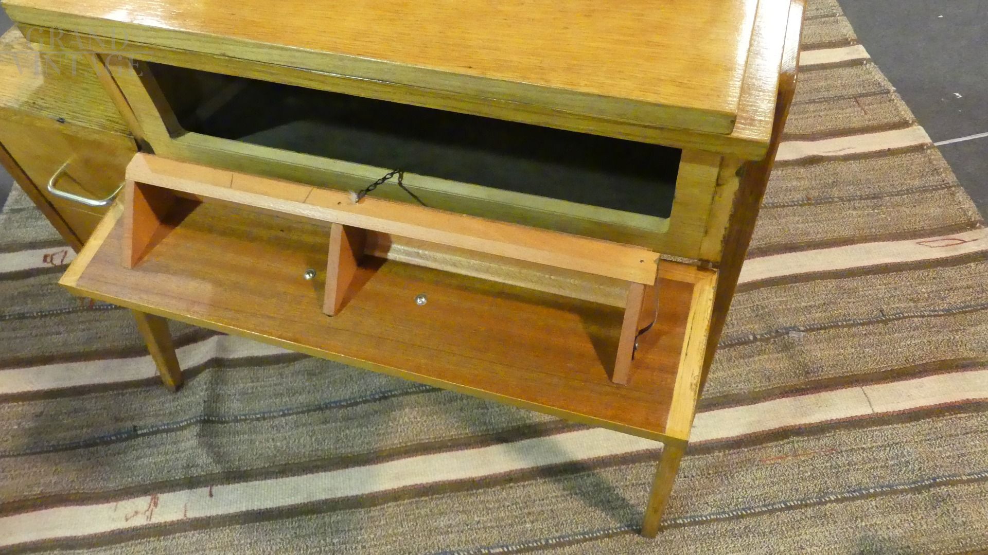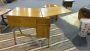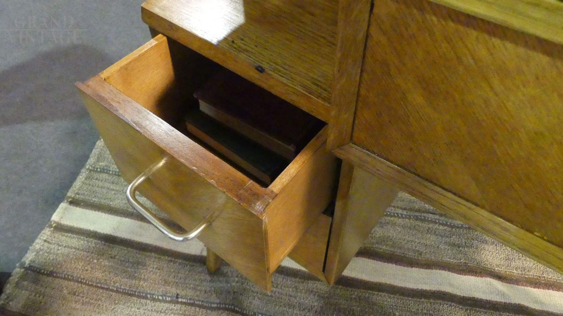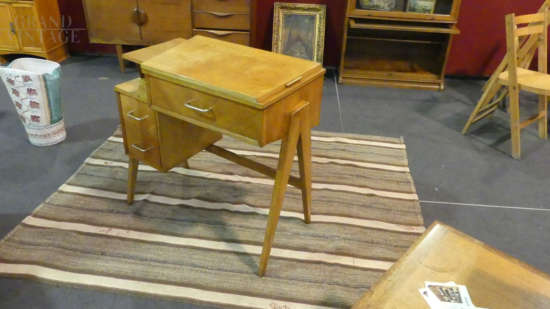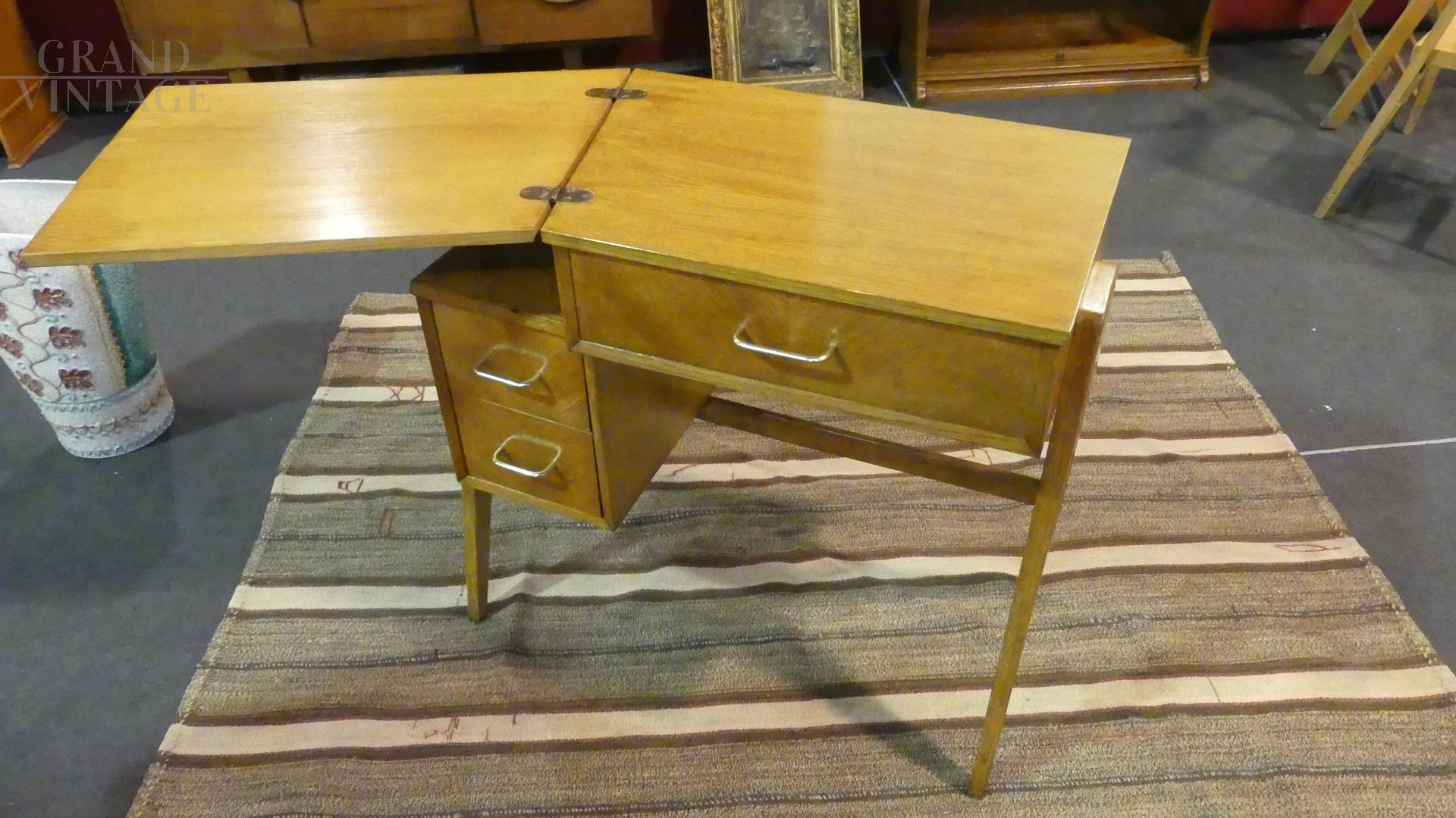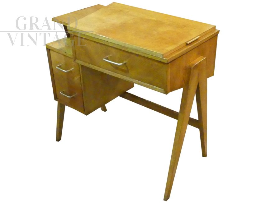 Scrivania del 1950 di provenienza Francese prodotta in legno di rovere biondo. Le gambe sono a compasso e il piano si apre in diagonale, con apertura di 120cm.
