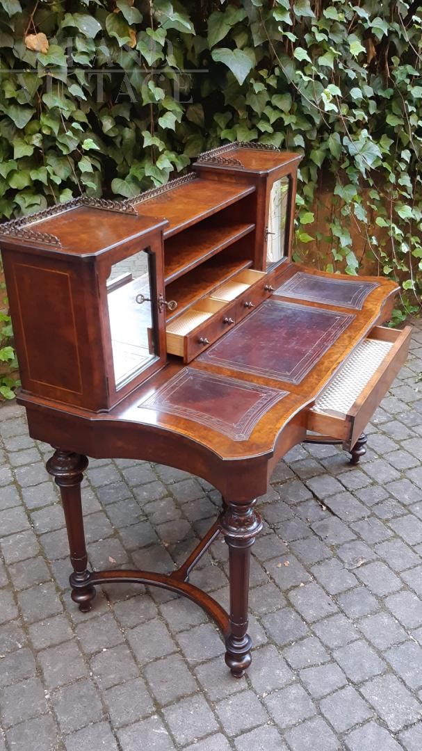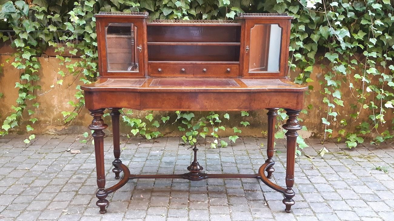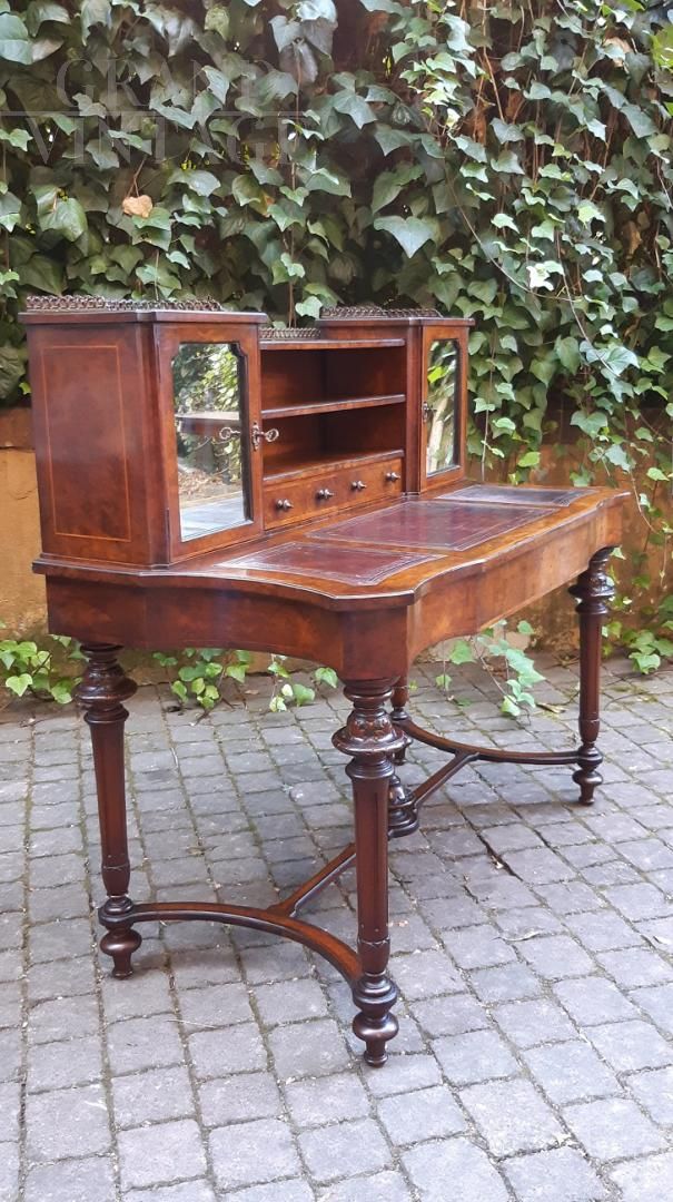 Elegante scrittoio lombardo antico del periodo Napoleone III (1852/70), disegnato e creato allo scopo di accontentare le richieste più esigenti. Questo insieme di movenze è interamente lastronato in radica di noce e filettato, dalla traversa di base allo scarabattolo superiore, in legno di ciliegio radicato affiancato da un secondo filetto in legno di acero. Ulteriori arricchimenti li troviamo in raffinati intagli sui basamenti ed inserti in ottone, come ferma oggetti, tipici dello stile. Mobile raro integro e consigliato.