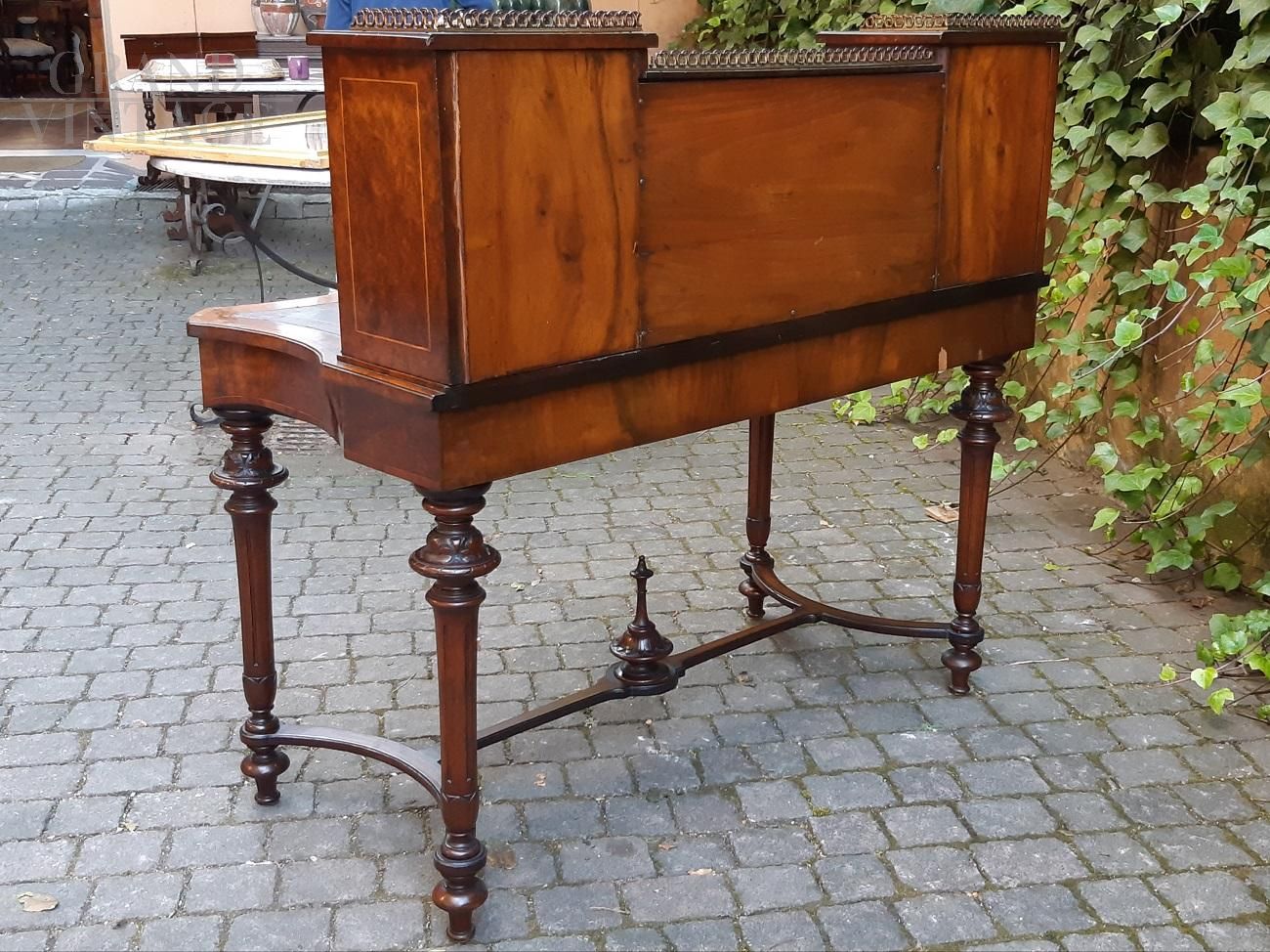 Scrivania lombarda antica con alzata, in radica di noce e filetti