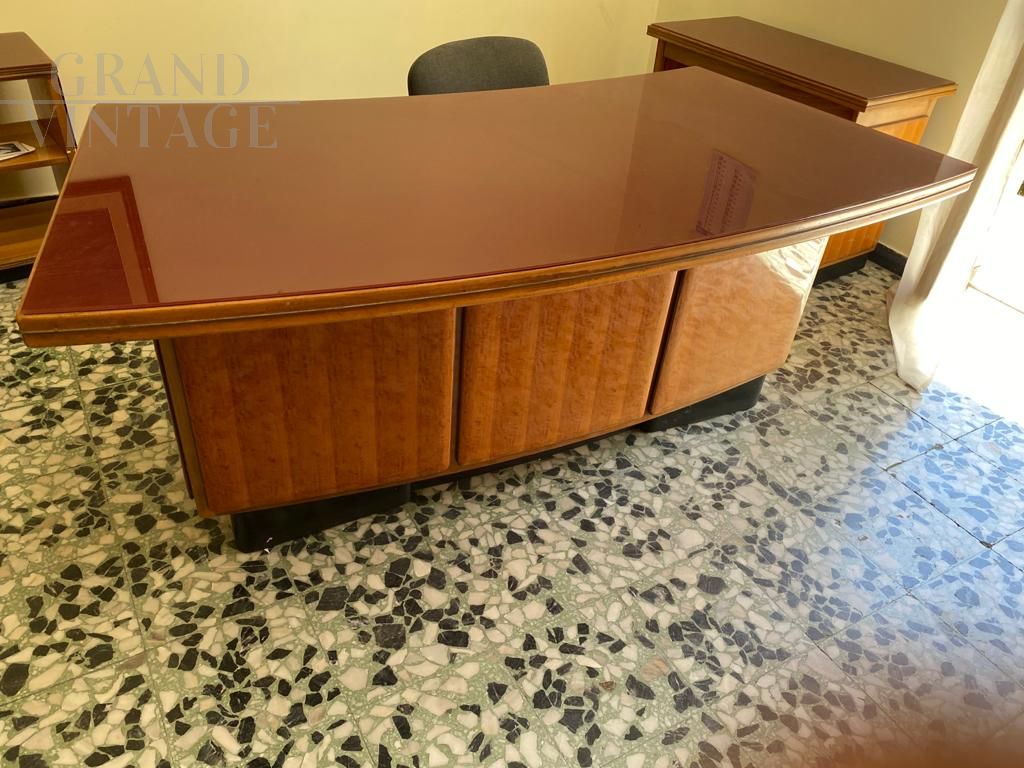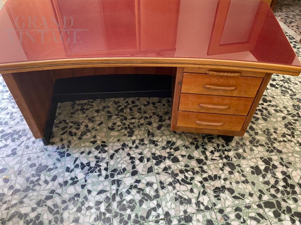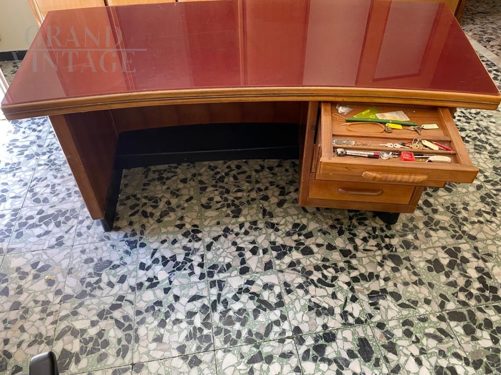 Bellissima scrivania dirigenziale Anonima Castelli modello President della serie C60, con struttura in legno di noce nazionale, 3 cassetti sul lato destro più un cassettino sottopiano, poggiapiedi in ferro e piano in vetro retrolaccato in bordeaux.