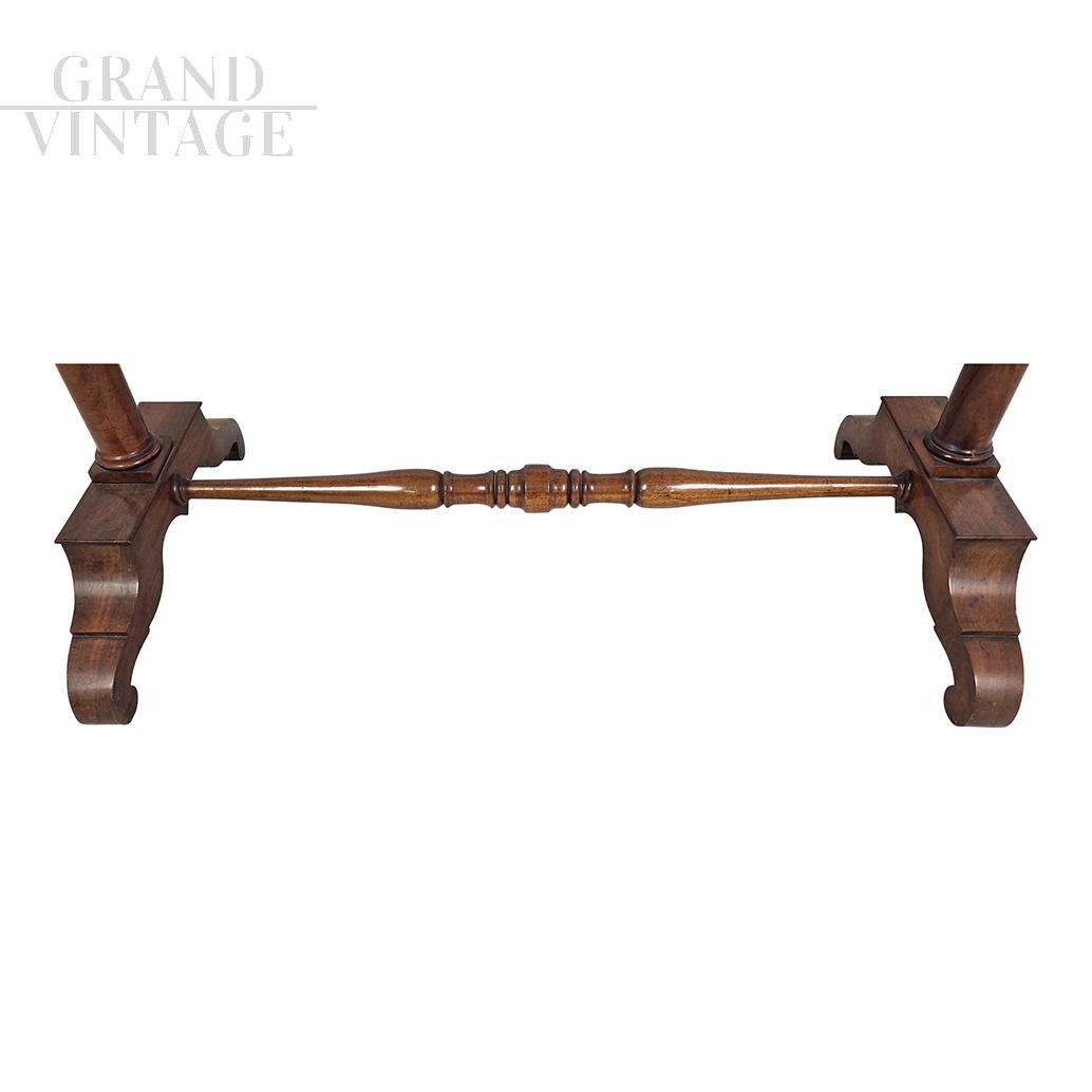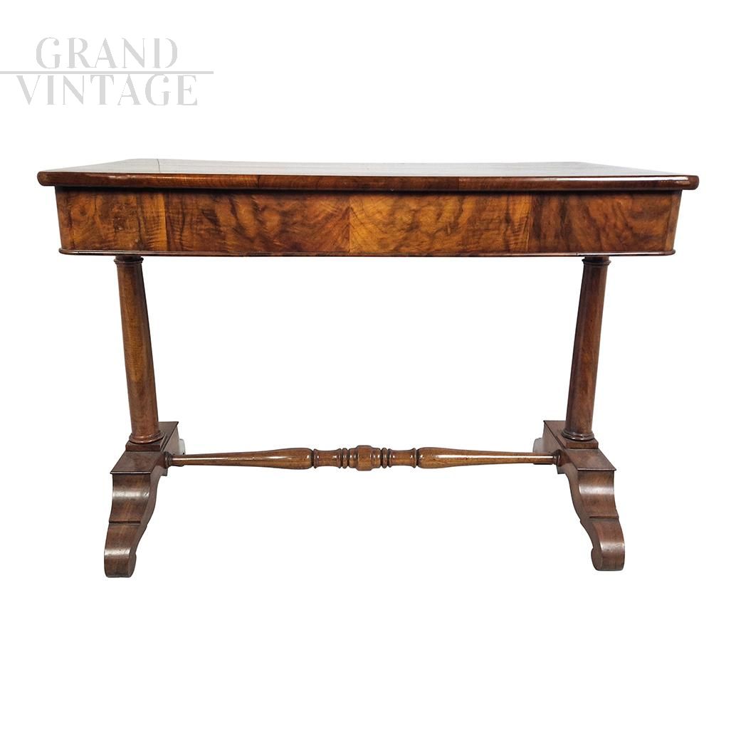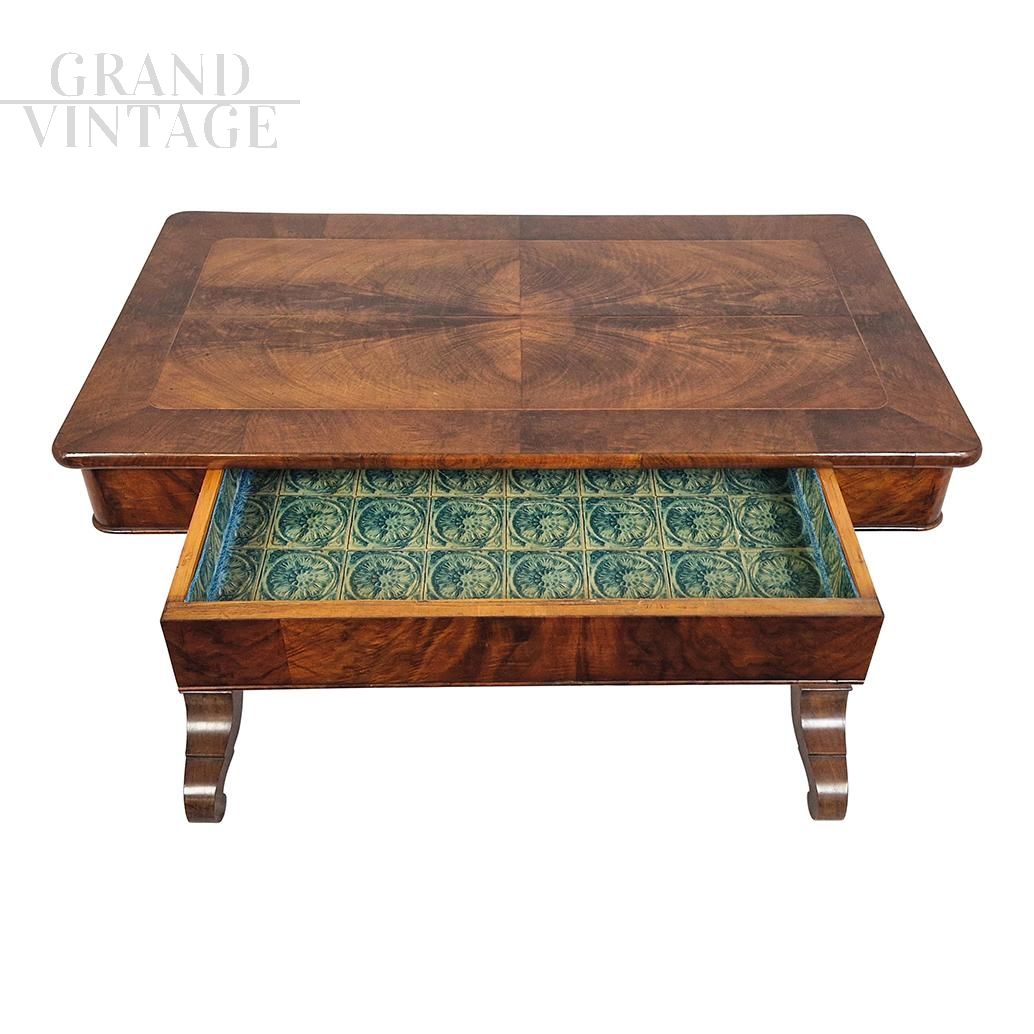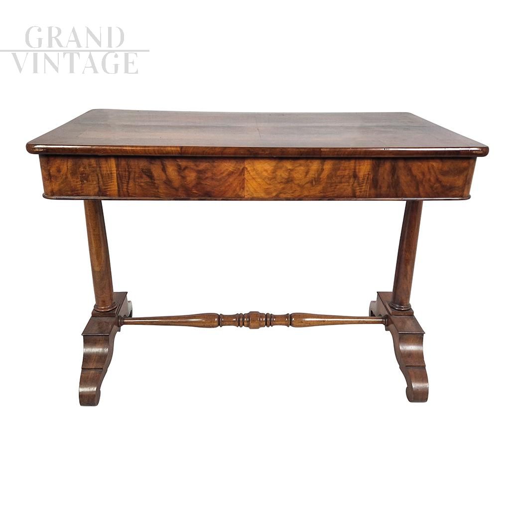 Scrivania scrittoio antico di epoca Biedermeier dell'800 in legno impiallacciato in noce e radica di noce, dotato di cassetto sotto il piano.