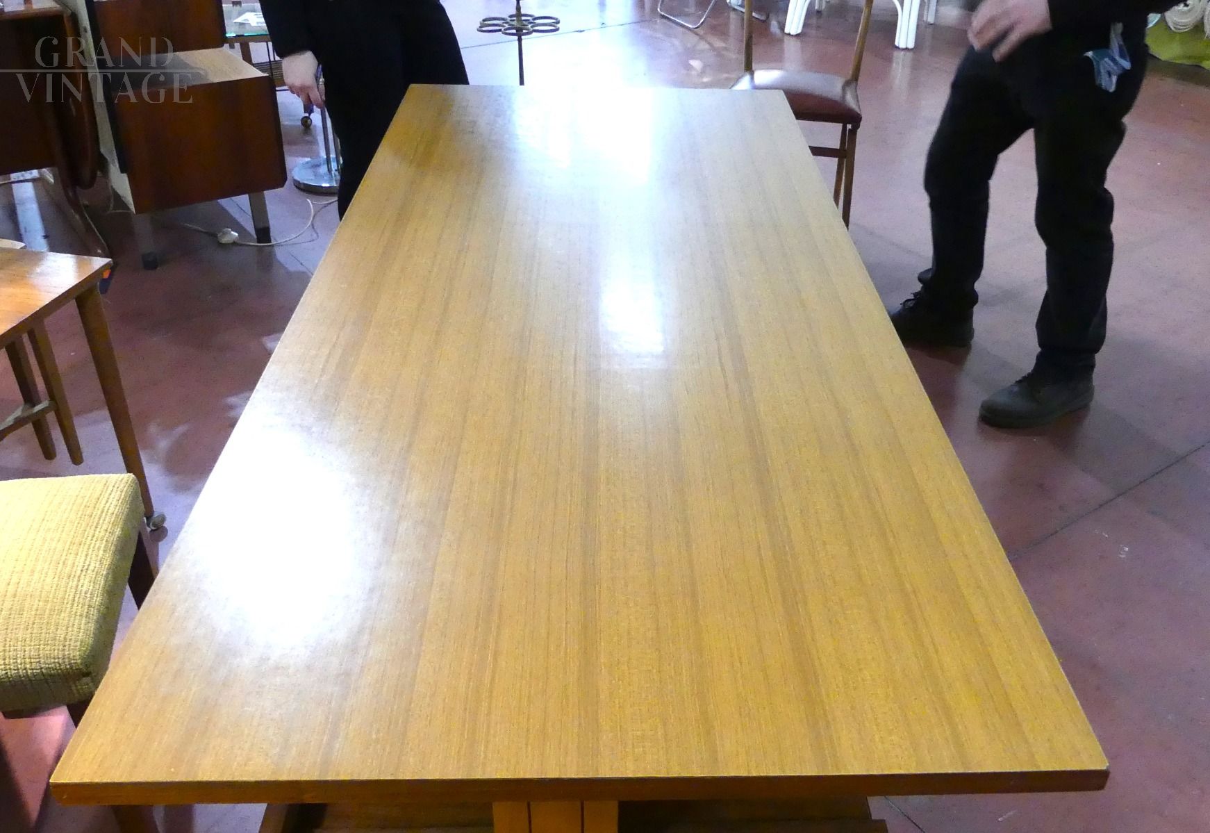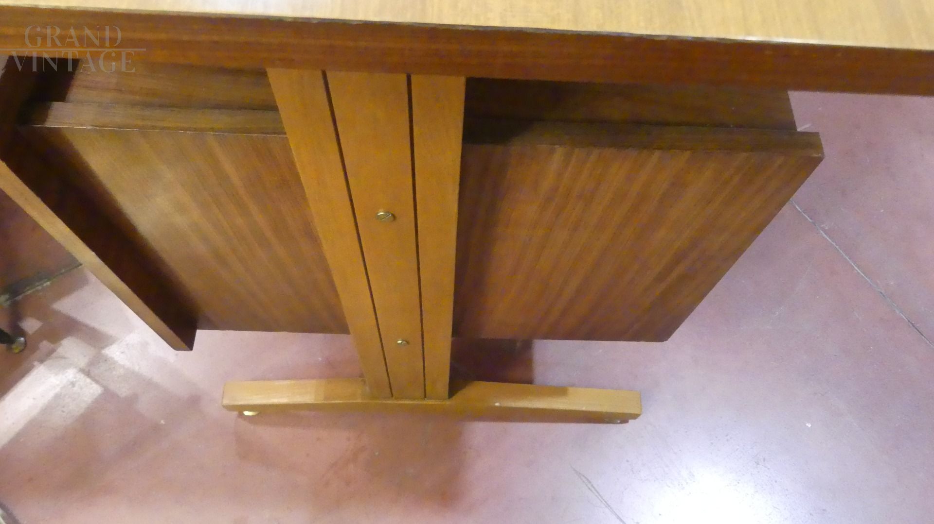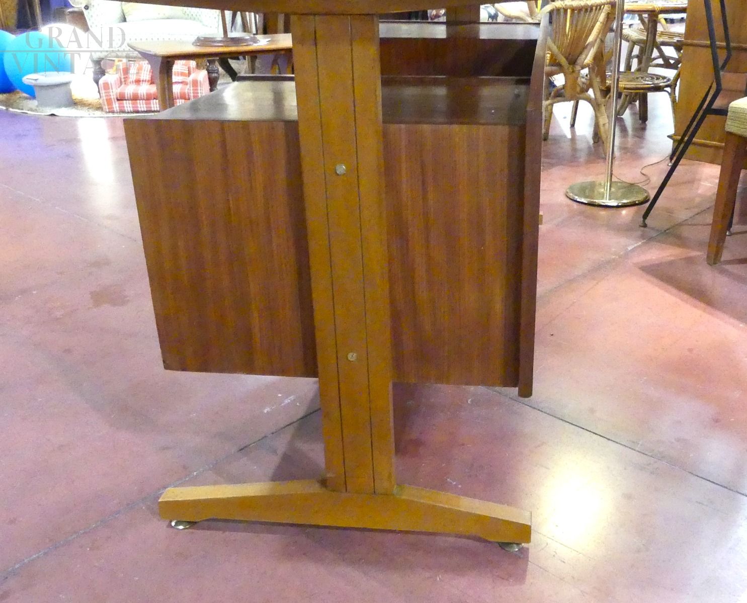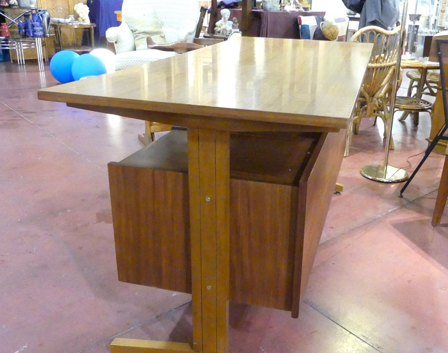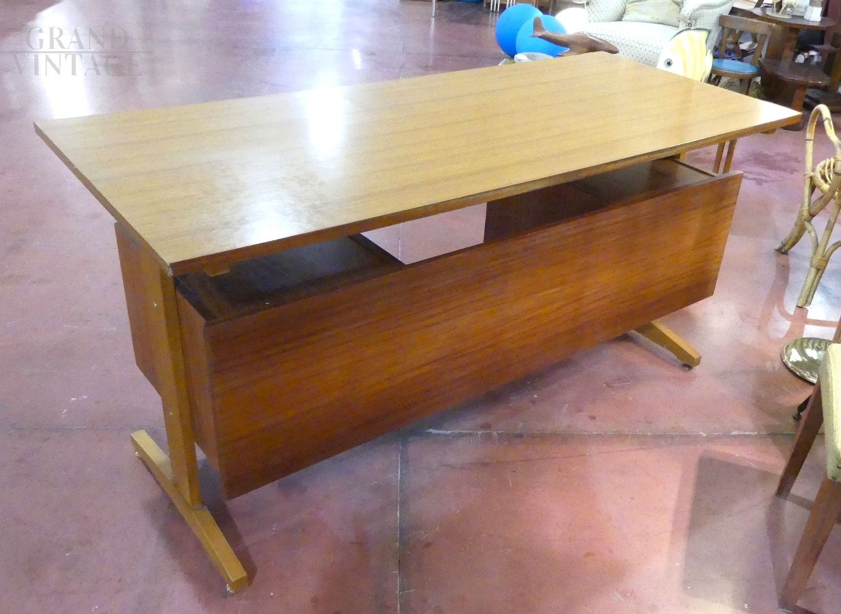 Scrivania vintage da centro in legno di teak, con doppia cassettiera ai lati, poggiapiedi in ferro e piedini in ottone regolabili.