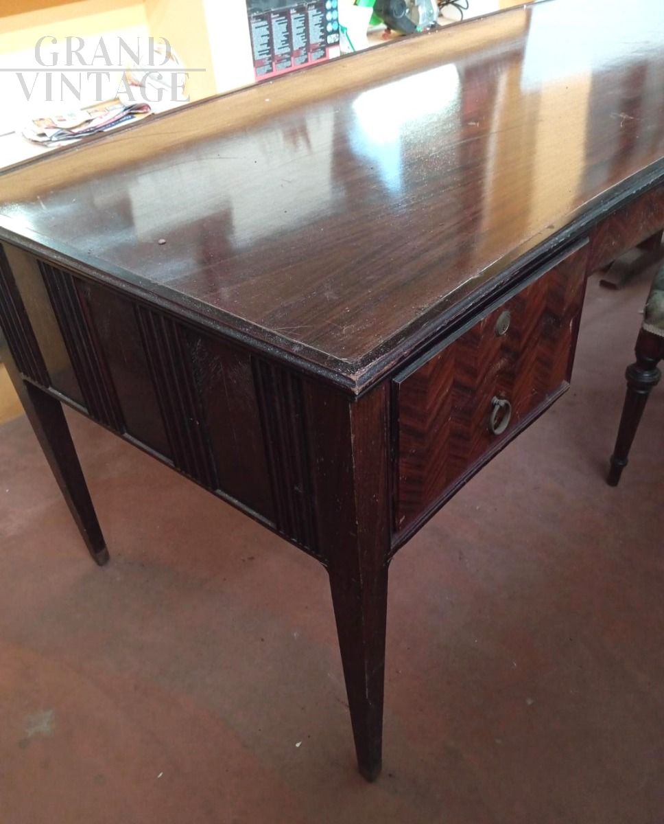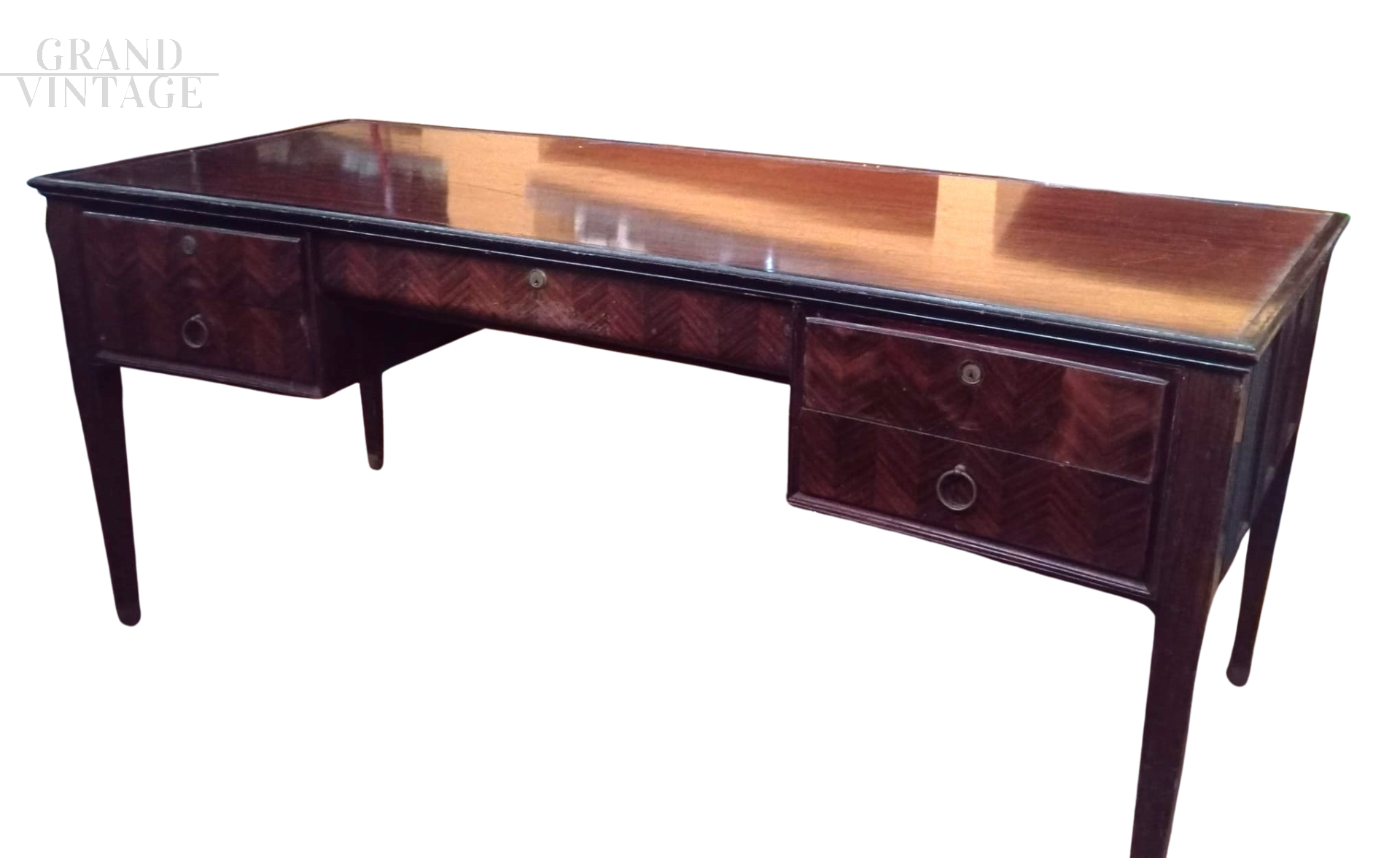 Grande scrivania dirigenziale vintage in legno di mogano con piano leggermente a fagiolo, i cassetti sono impreziositi da un intarsio spinato - a spina di pesce, i fianchi hanno invece un motivo a rilievo. La scrivania è da centro, ben rifinita su tutti i lati, proviene dagli anni '60 e presenta i naturali segni del tempo.