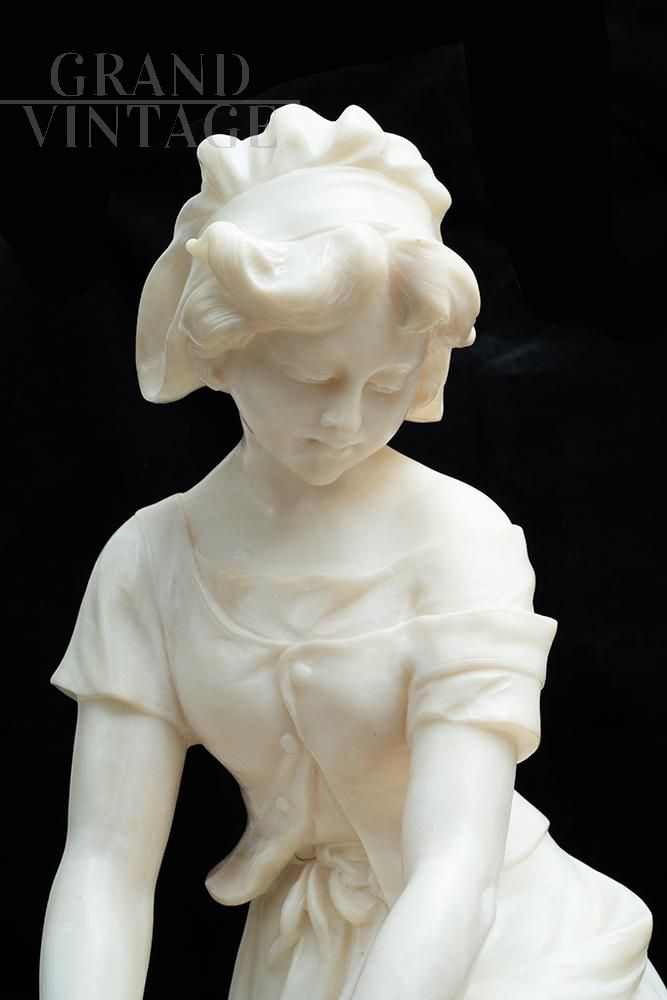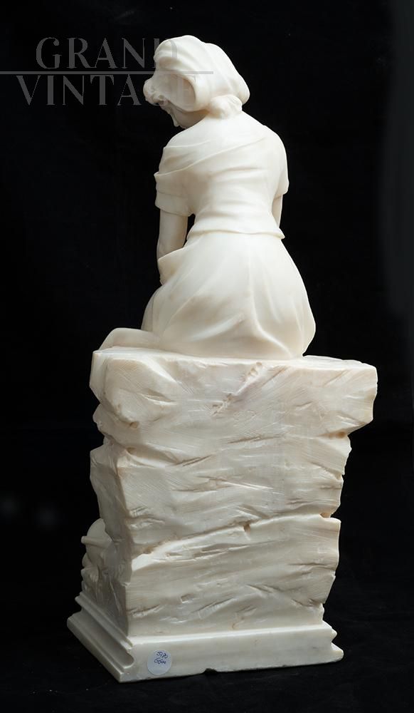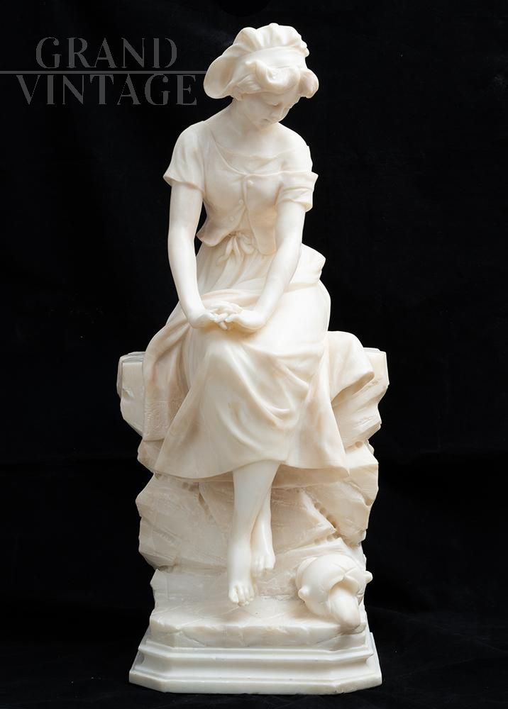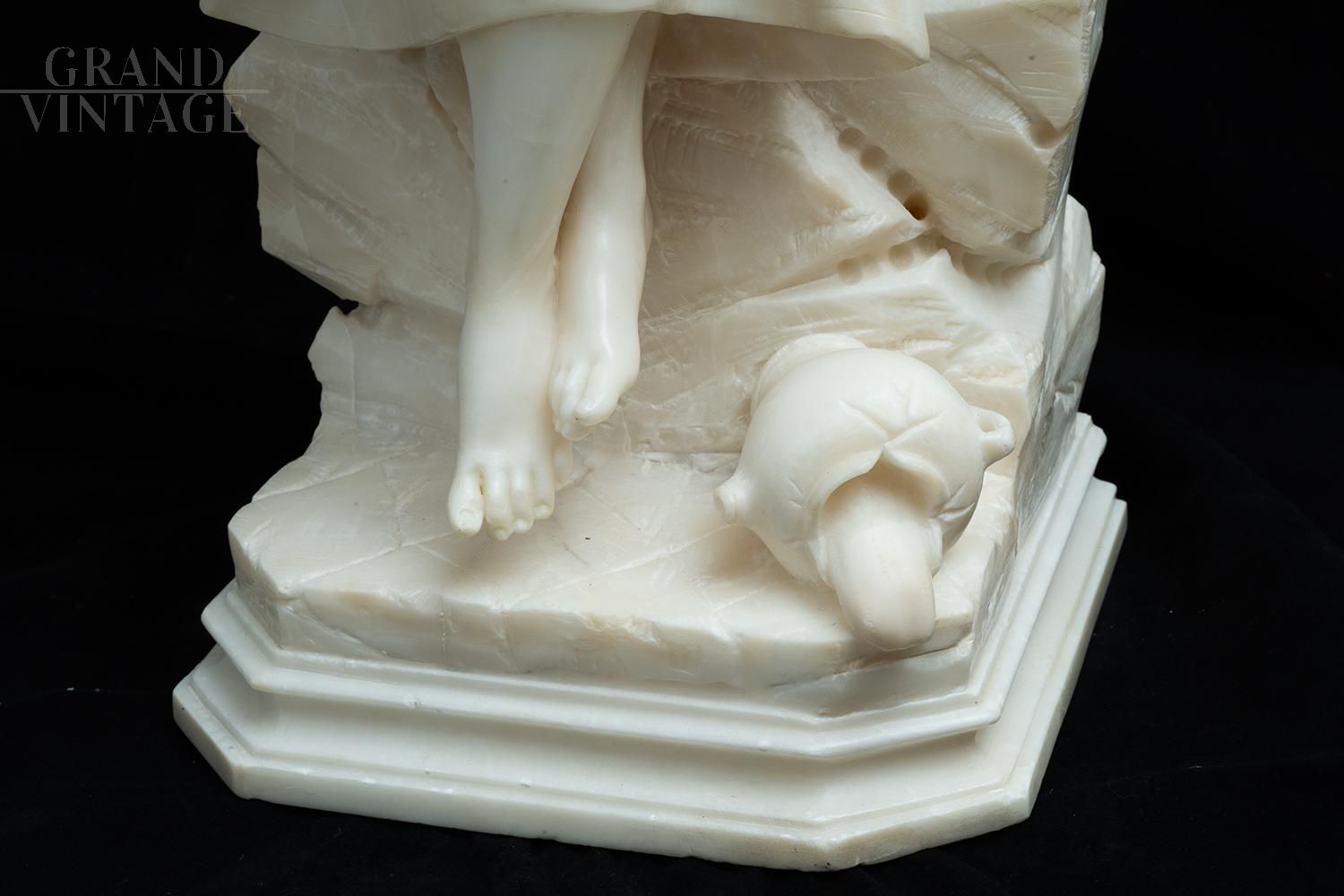 Scultura antica Napoleone III Francese in alabastro appartenente alla seconda metà del XIX secolo. La donna in atteggiamento romantico viene rappresentata seduta su uno scoglio con le mani incrociate intenta a guardare un'anfora sotto ai suoi piedi. In particolare la nostra scultura denota caratteristiche stilistiche, come la solida struttura dei volumi e il modo realizzativo del volto. La cura e la precisione dei dettagli, la finezza del volto delle vesti sono di elevatissima qualità.