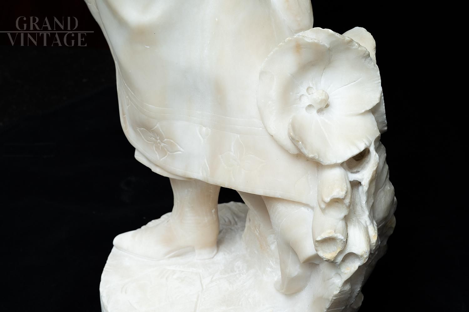 Scultura antica in alabastro del periodo Napoleone III Francese raffigurante una donna con fiori. La figura femminile si presenta con un abito molto leggero e con entrambi le mani a sostenere cascate di fiori. Con la mano destra mantiene una corona che le avvolge la testa, mentre con quella sinistra mantiene un bouquet sempre di fiori. Il piede sinistro risulta poggiato su un prato e da uno slancio verticale all'intera figura. La cura e la precisione dei dettagli, la finezza del volto delle vesti sono di elevatissima qualità.