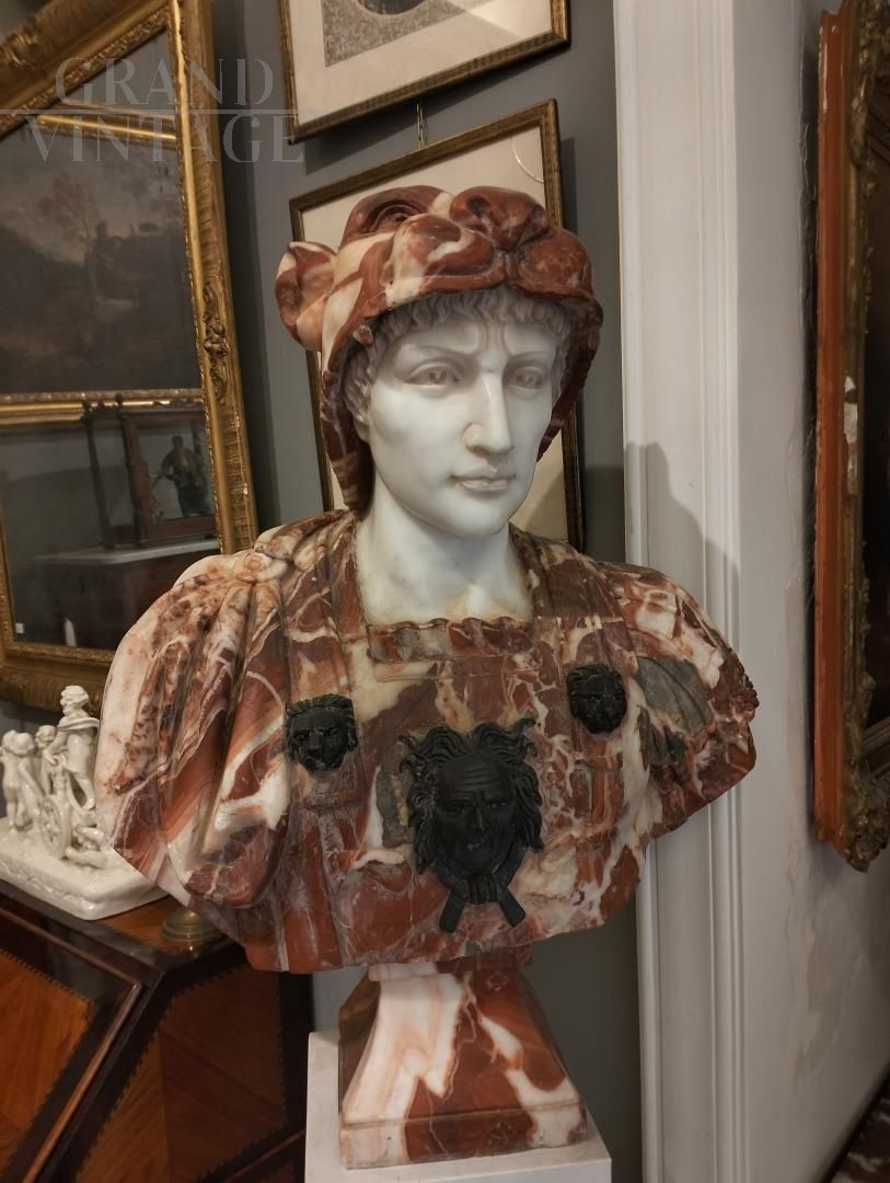 Busto realizzato con tre tipi di marmo: rosso Verona, nero di Belgio e bianco. Si presenta in ottime condizioni.