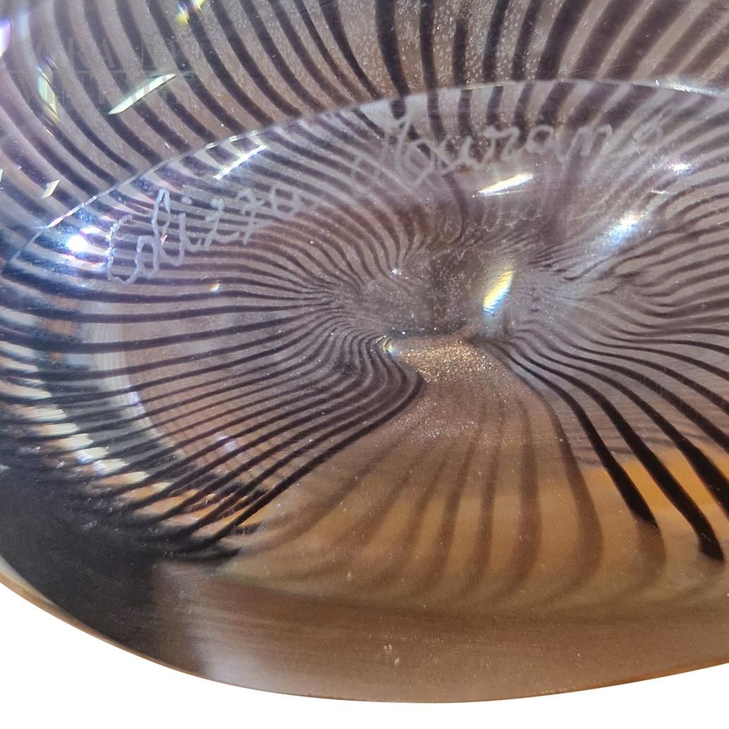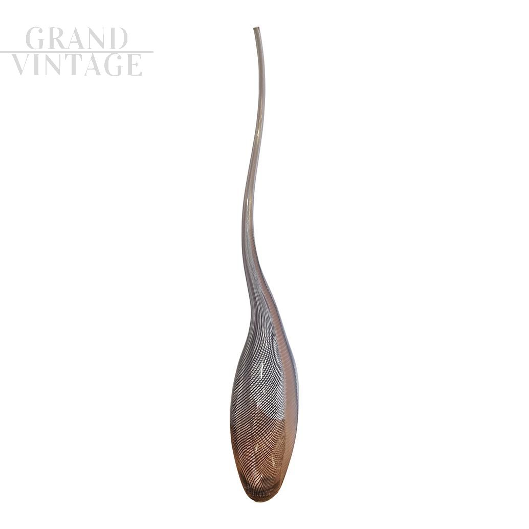 Scultura di Colizza Murano in vetro artistico di Murano color marrone con fitte striature nere, firmata alla base, realizzata secondo la tradizione dai maestri vetrai all'interno delle fornaci di Murano, a Venezia. Lavorato a freddo, questo vaso in vetro soffiato presenta satinature colorate intrecciate con line nere che le conferiscono una particolare sinuosità cromatica. La forma morbida allungata e lo spessore della materia lo identificano come un elegante e particolare oggetto di arredo.