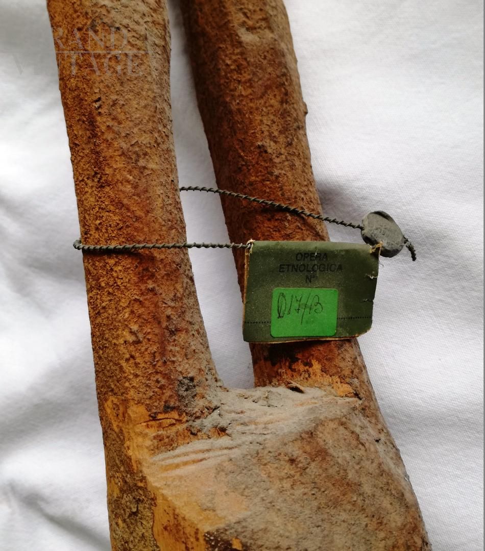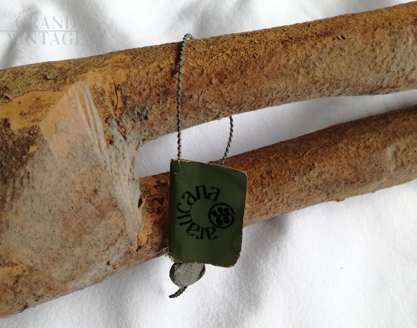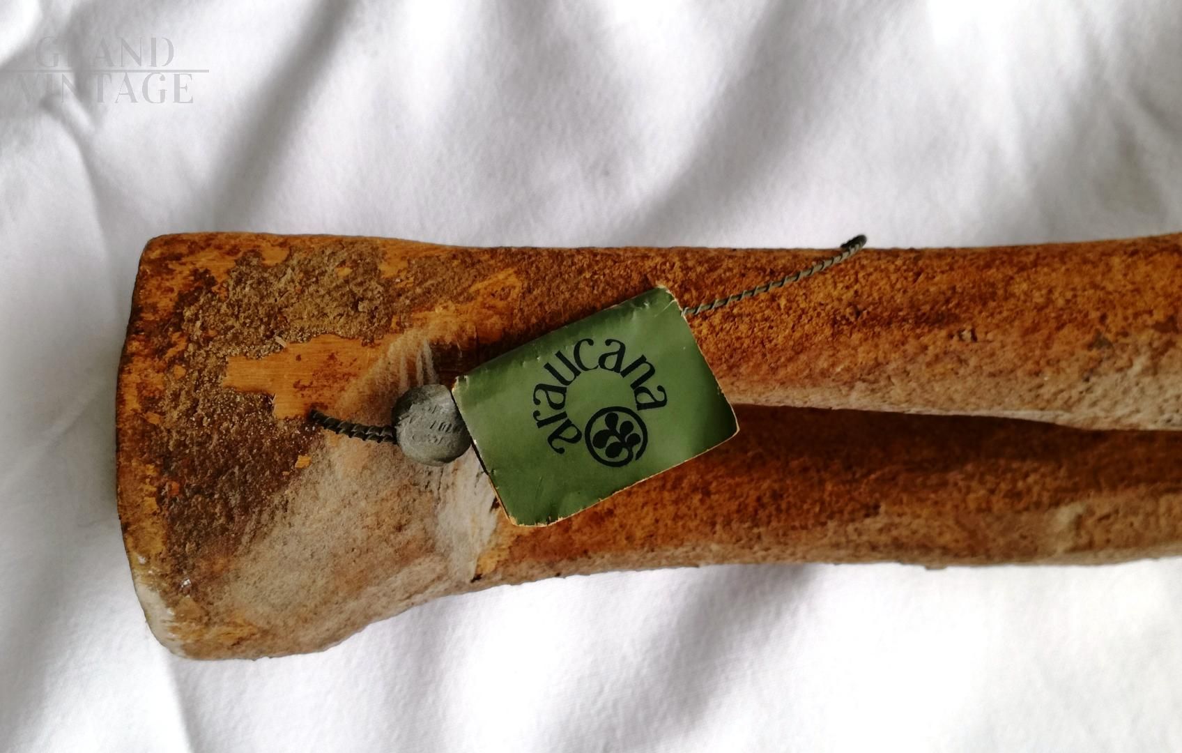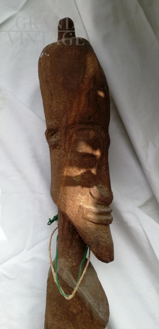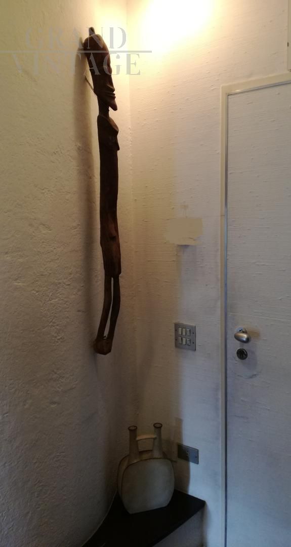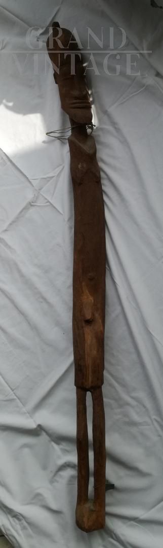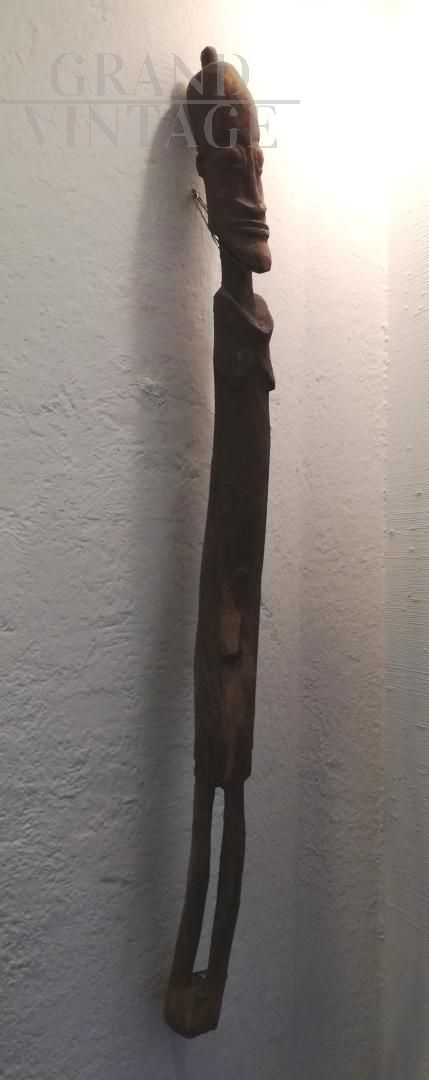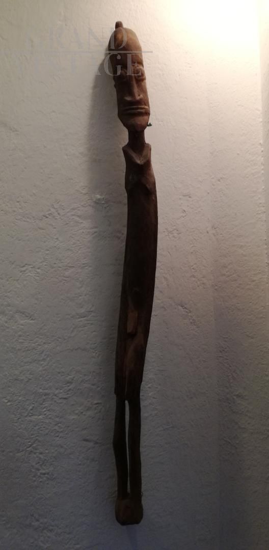 Scultura in legno con figura longilinea, arte africana anni '70, ritratto di antenato in legno leggero e poroso. La scultura è corredata da cartellino piombato con dicitura: Auracana - opera etnologica n° 017/b. Risale agli anni '70.