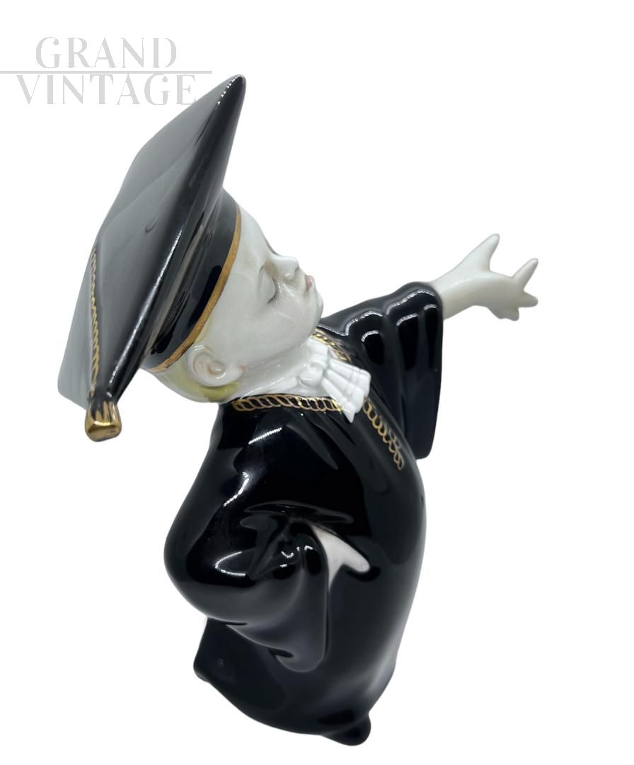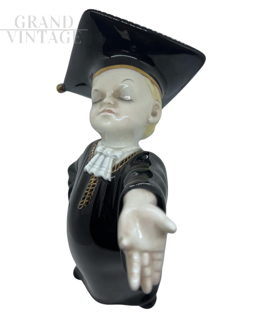 Scultura di avvocatino in ceramica realizzata da Mario Mesini per Lenci nel 1930 con tecnica a colaggio e dipinta in policromia con finiture in oro, raffigurante un bimbo avvocato con toga nera. Sotto la base reca la firma a mano "Lenci made in Italy ". La statua è in ottime condizioni, senza segni di usura.