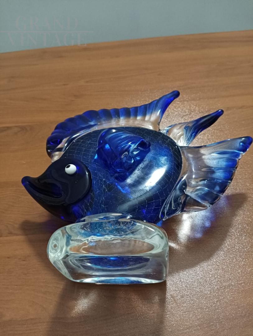 Stupenda scultura in vetro vintage attribuibile a Cenedese raffigurante un pesce nei colori blu e bianco, blu scuro e riflessi in oro.