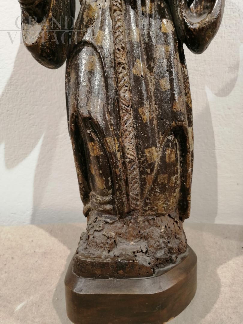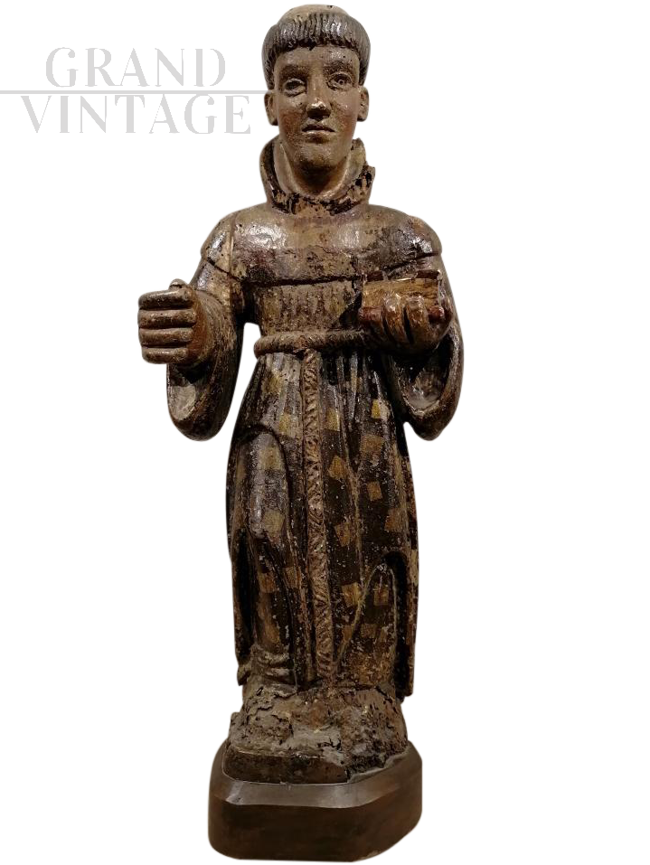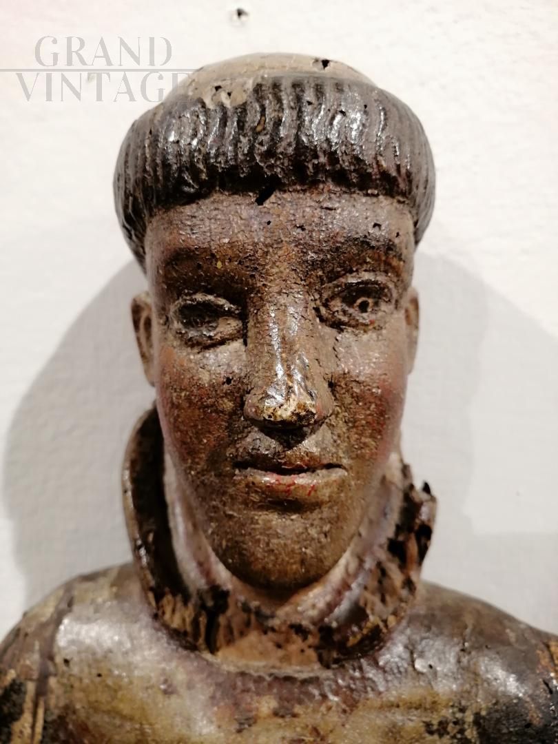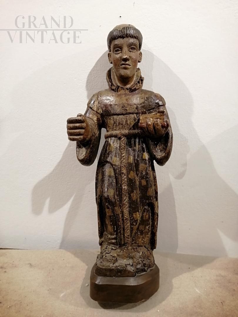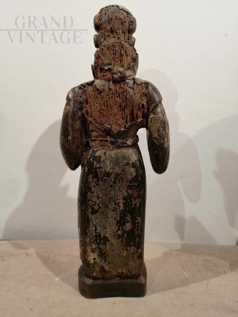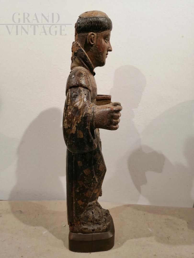 Scultura religiosa antica del 1300 in legno raffigurante un santo o un frate francescano.