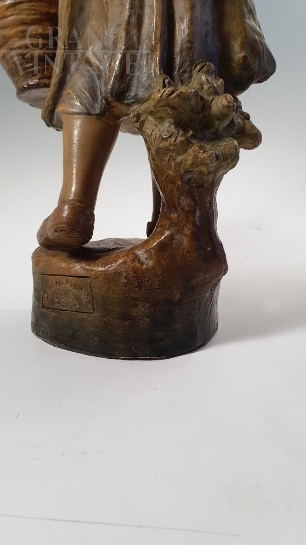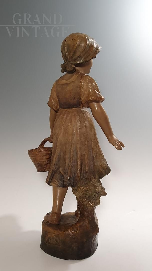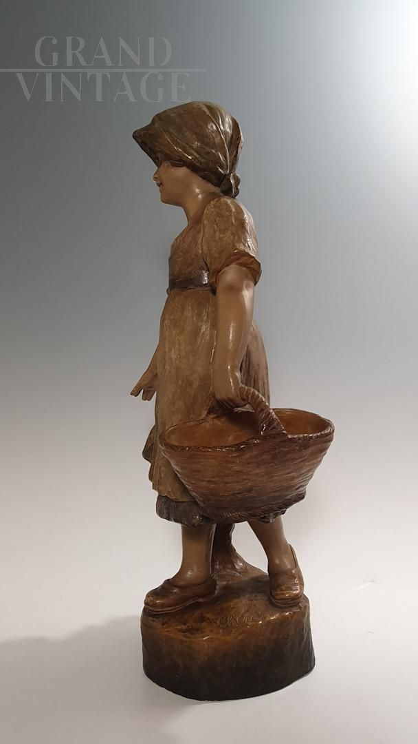 Scultura Goldscheider in terracotta raffigurante giovane fanciulla con cestino in mano, firmata Cherc, completa di marchio, numero e timbro della manifattura.